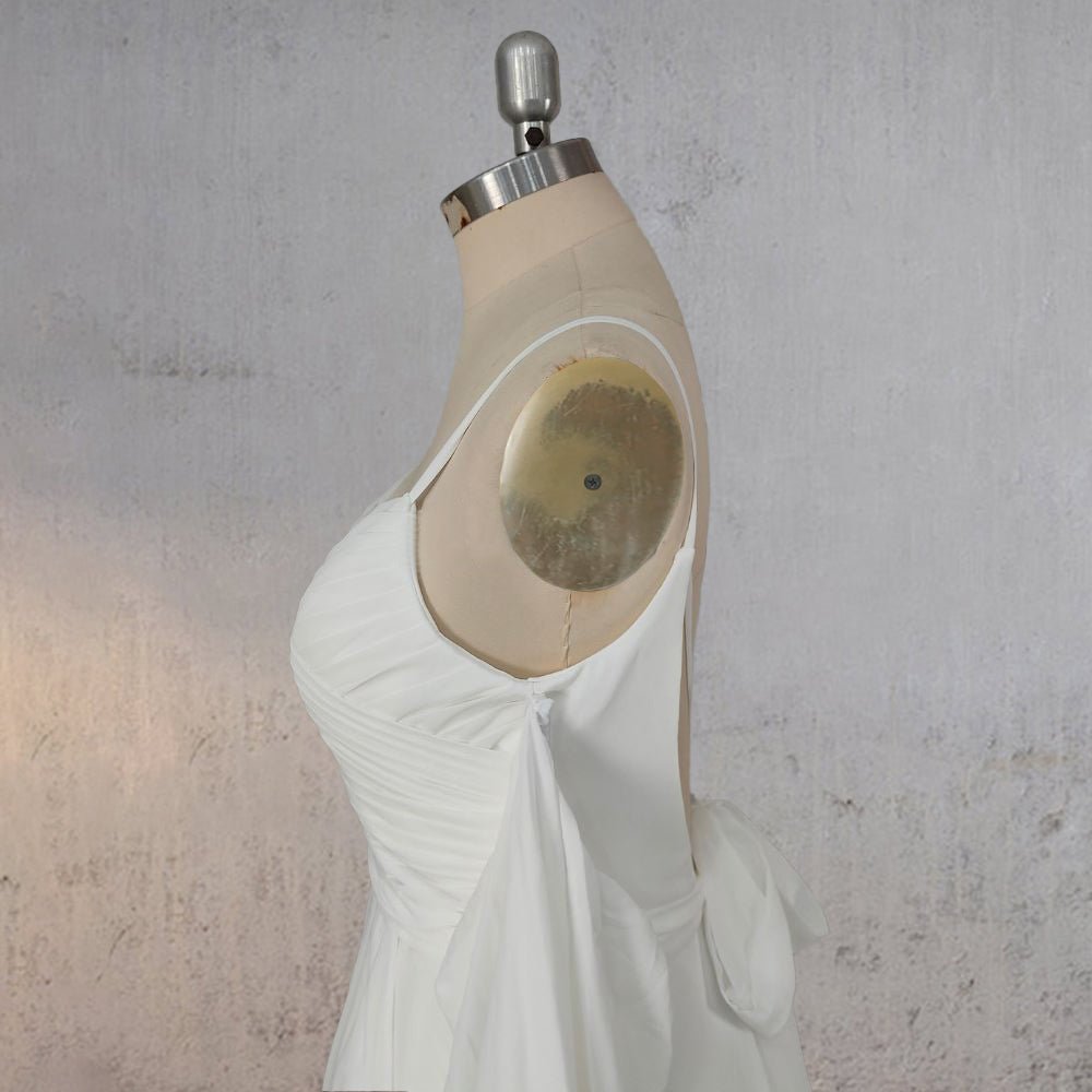 This enchanting A-Line gown, crafted from soft chiffon fabric, offers a perfect blend of romance and elegance. Available in White, Ivory, Champagne, and Black, this dress is versatile and timeless, ideal for brides seeking both beauty and comfort on their special day. The sweep train adds a graceful flow, trailing softly behind you as you walk down the aisle. The spaghetti straps neckline brings a touch of delicacy, while the detachable sleeves offer flexibility—giving you the option to transform your look from ceremony to reception with ease. The backless design adds a modern touch, drawing attention to your back and shoulders, creating a sultry yet sophisticated look. Embellished with charming bow-knot details and soft ruffles, this gown exudes a playful yet elegant vibe. These intricate touches elevate the design, adding texture and movement, ensuring you shine with grace and style on your wedding day.