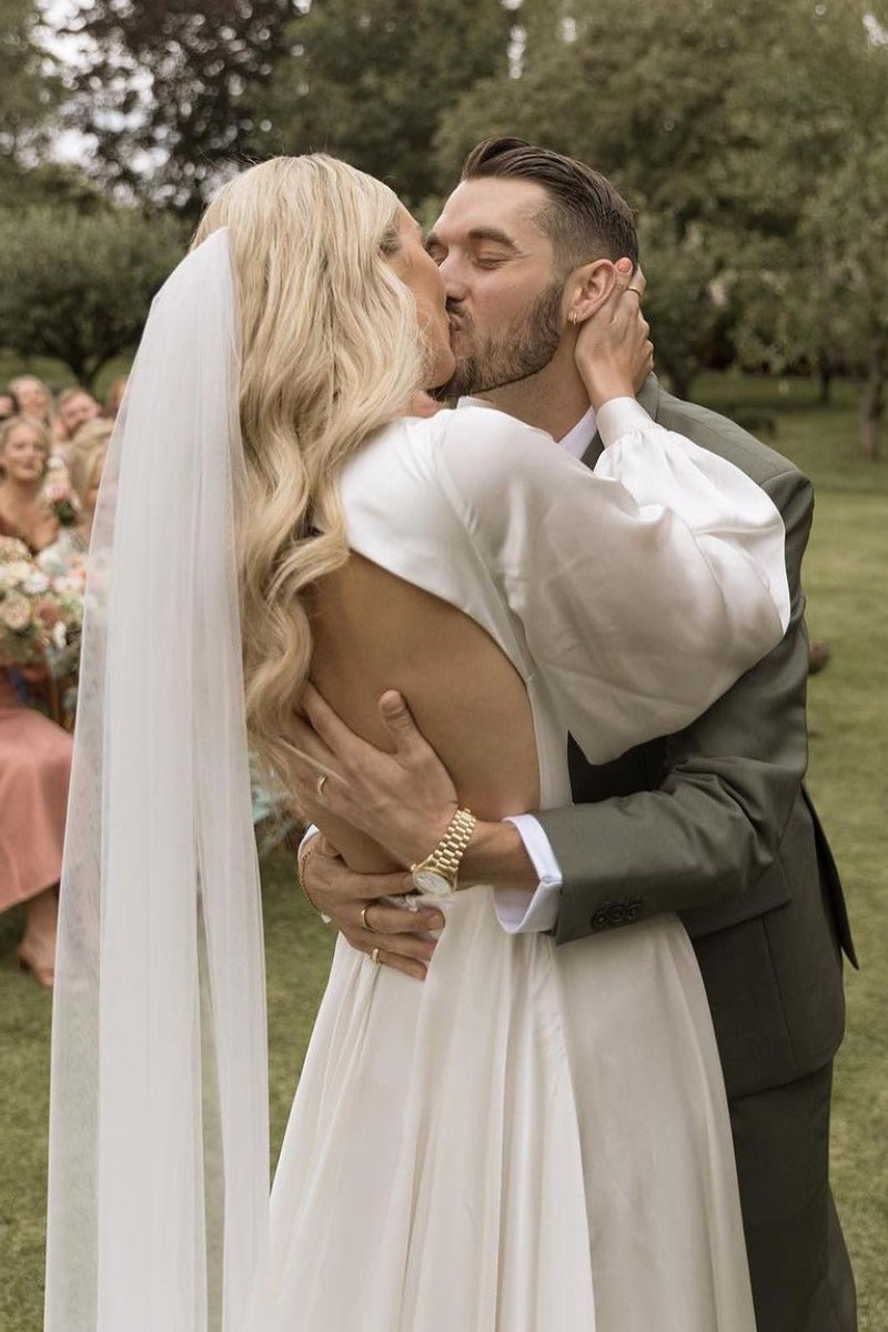 This stunning bridal gown exudes understated elegance and sophistication, making it the ideal choice for a bride who wants to make a lasting impression. The A-line silhouette gracefully elongates the figure, while the sweep train adds a touch of regal flair as it trails beautifully behind you. Crafted from luxurious satin fabric, the gown shimmers with a soft, refined sheen that captures the light from every angle. The V-neckline creates a flattering and feminine shape, drawing attention to the décolletage in an elegant yet tasteful way. Long sleeves add an air of refinement and warmth, balancing the gown's open back, which offers a daring yet classy detail that adds modern allure. In a classic White color, this bridal gown is both timeless and striking, making it the perfect choice for the bride seeking a blend of traditional beauty and contemporary sophistication.
