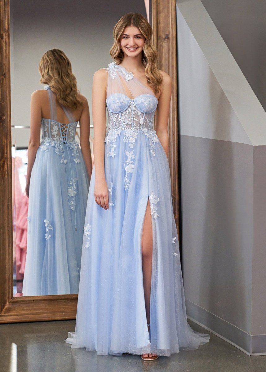 liExperience striking elegance in the Kissprom One Shoulder Long Prom Dress! This flirty yet sophisticated dress is perfect for making a statement on any special occasion. It features an elegant one-shoulder design and detailed black appliques for added drama and luxe appeal. The long, slim silhouette is designed to hug your curves gracefully, accentuating all the right places. Best of all, high front and back slits give you freedom of movement so you can dance the night away in comfort. Whether as evening dresses or an formal dresses, the Kissprom One-Shoulder Long Prom Dress will have you turning heads!