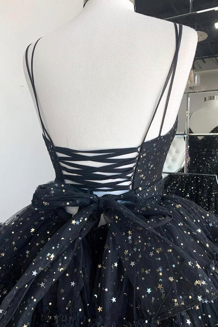 Make a celestial entrance with "Nathalia." This A-line high-low dress is your ticket to standing out from the crowd. Crafted from star-pattern sequined tulle fabric, embodying the mystery and allure of the cosmos. The spaghetti-strap and V-neck neckline offer a touch of romance, allowing for an exquisite show of collarbones and shoulders. Its multi-tiered skirt flows gracefully, capturing the essence of cascading stardust, while the sweep train ensures every exit is as memorable as your entrance. Completing its luxurious design is the lace-up back, ensuring a perfect fit. An ideal choice for evening dresses, with its shimmering sequins and elegant silhouette, guaranteed to catch attention at any soirée. For formal dresses, Nathalia offers a stunning blend of romance and sophistication, perfect for upscale events where you want to shine.