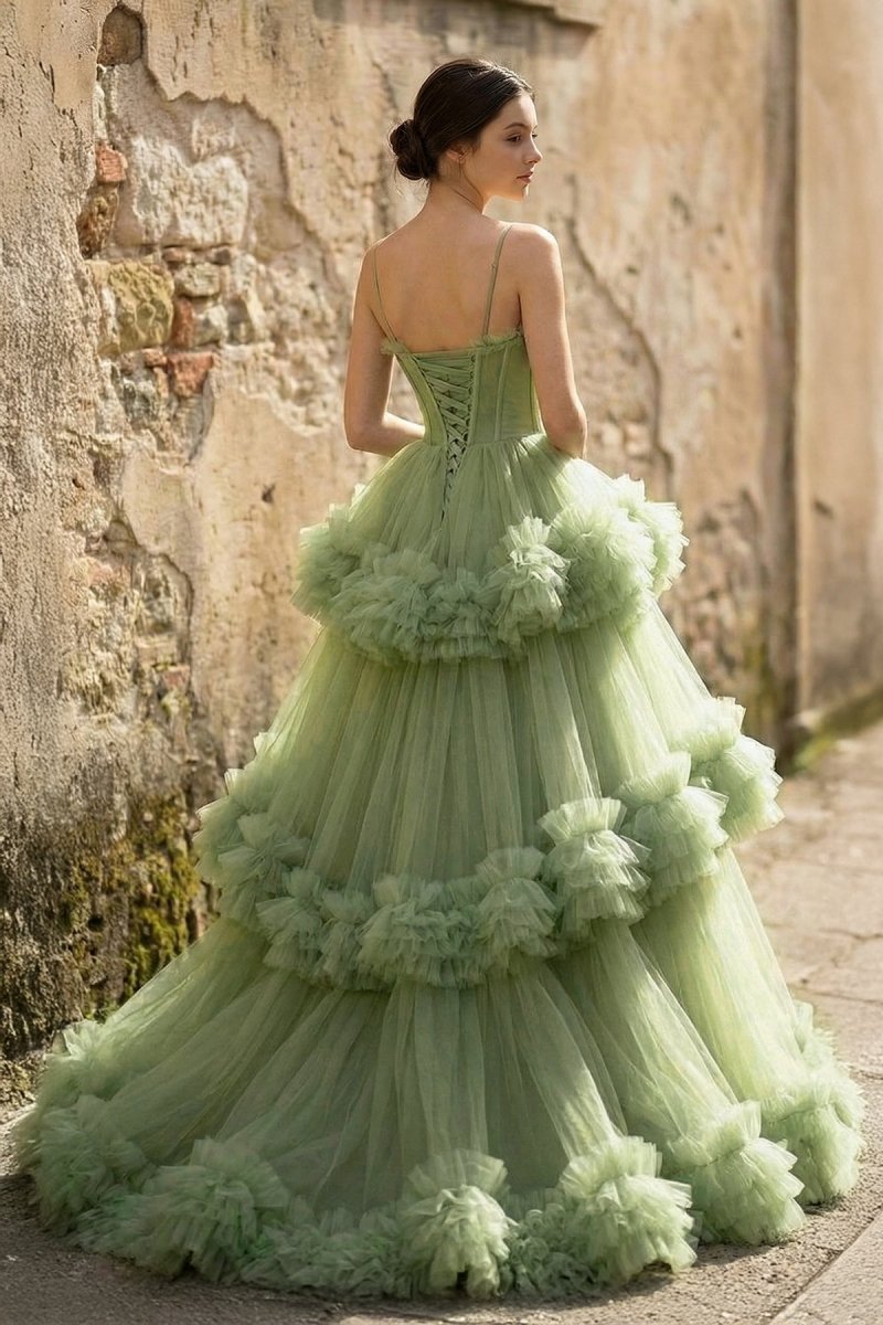 Introducing the Blakely Dress, where enchanting A-line silhouettes meet an ethereal sweep train to create a head-turning masterpiece in tulle fabric. The spaghetti-strap and sweetheart neckline offer a feminine touch, tastefully highlighting the collarbone area. An ideal choice for both evening dresses and formal dresses, with its sleeveless design letting you flaunt your toned arms while keeping you cool on a warm evening. The bodice features intricate pleating, elevating the dress's aesthetic and adding a luxurious depth to the green color. The eye travels down to the multi-tiered ruffled skirt that softly cascades, mimicking the elegance of a waterfall. Every layer dances with you, creating a floating vision that will captivate the room. Finally, the lace-up back ensures a custom fit, embracing your curves in all the right places. Dress Blakely is perfect for the woman aiming to blend timeless elegance with a sprinkle of fairy-tale magic.