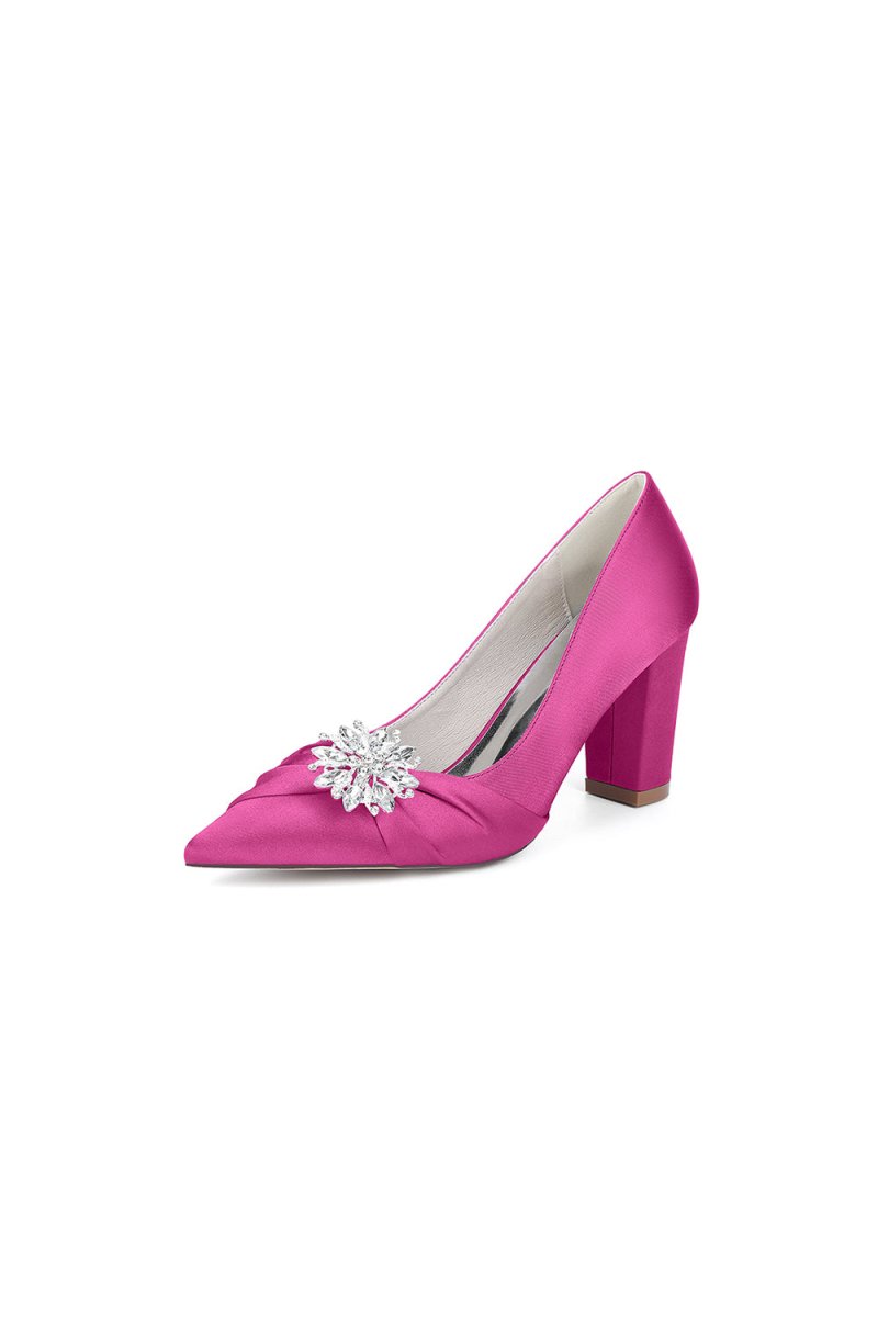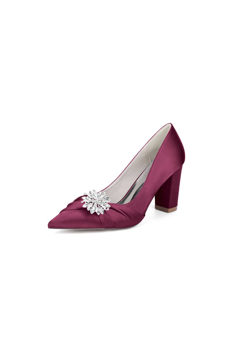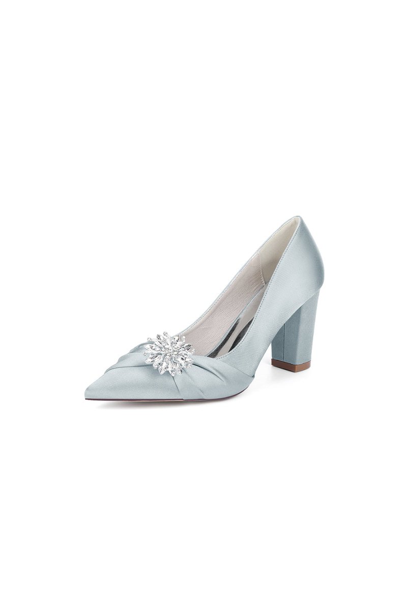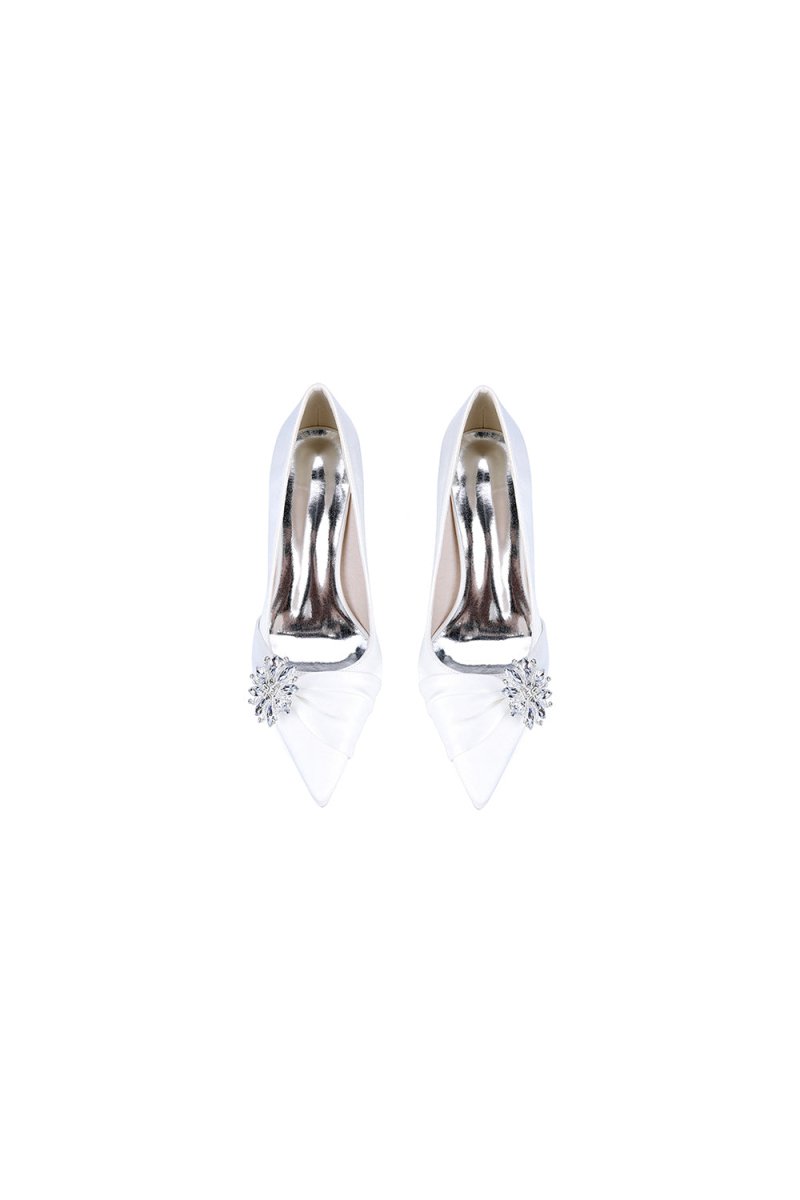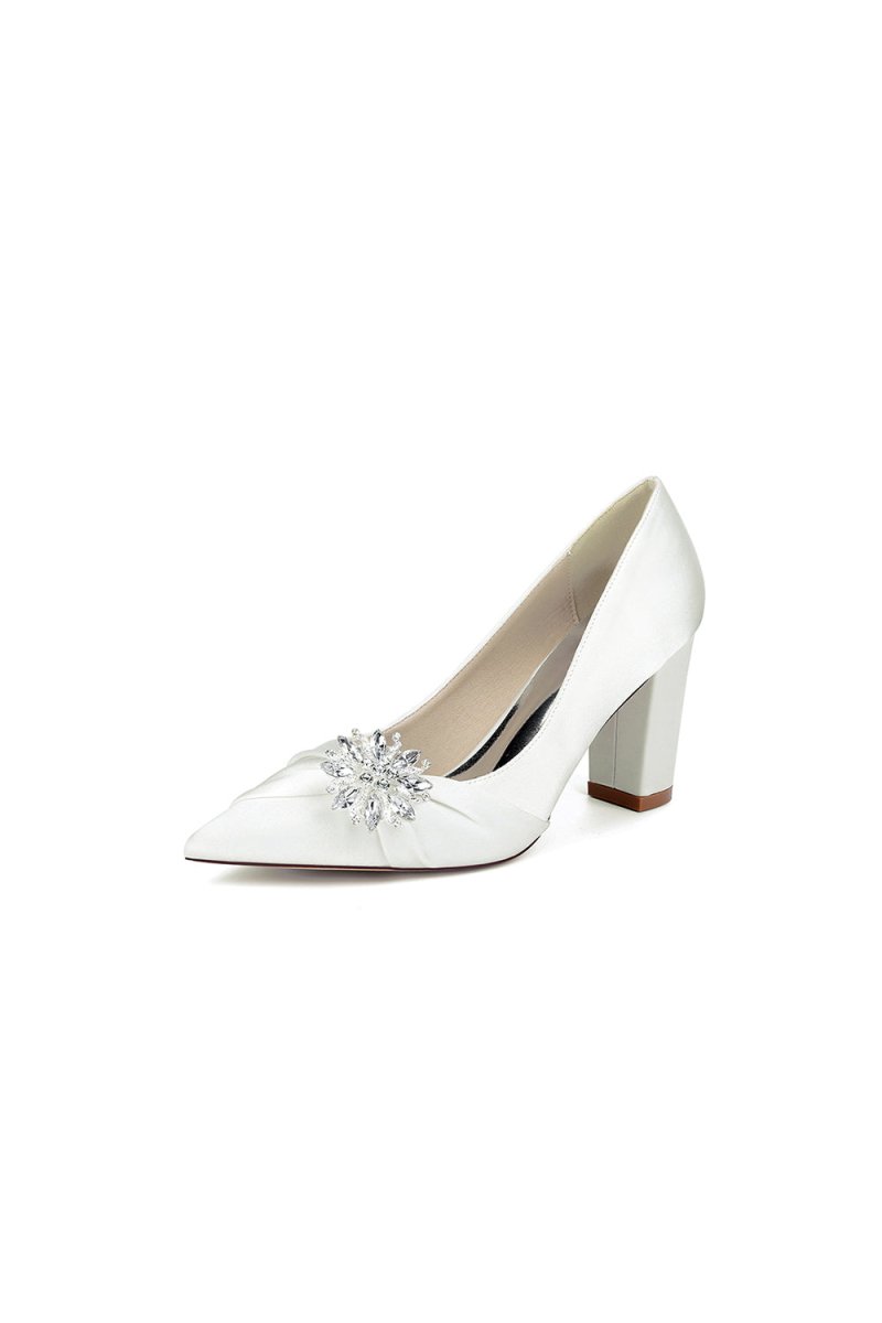 Indulge in timeless elegance and sophistication with these exquisite white satin high heels. Crafted with a classic pointed-toe silhouette, these shoes boast a sleek and immaculate satin upper that exudes a sense of purity and refinement. The sturdy, thick heel provides unparalleled support and stability, while its natural brown hue adds a warm, earthy touch to the design, creating a stunning contrast with the white satin. A standout feature of these heels is the magnificent crystal flower accent that adorns the vamp. Composed of clear and silver crystals arranged in intricate patterns, this captivating embellishment catches the light and radiates with a luxurious shimmer. Perfect for formal occasions and special events, these high heels are a true statement piece. Against a simple background, these white satin beauties with a dazzling crystal flower accent are bound to captivate all eyes. Elevate your wardrobe with these exquisitely designed and meticulously crafted heels.