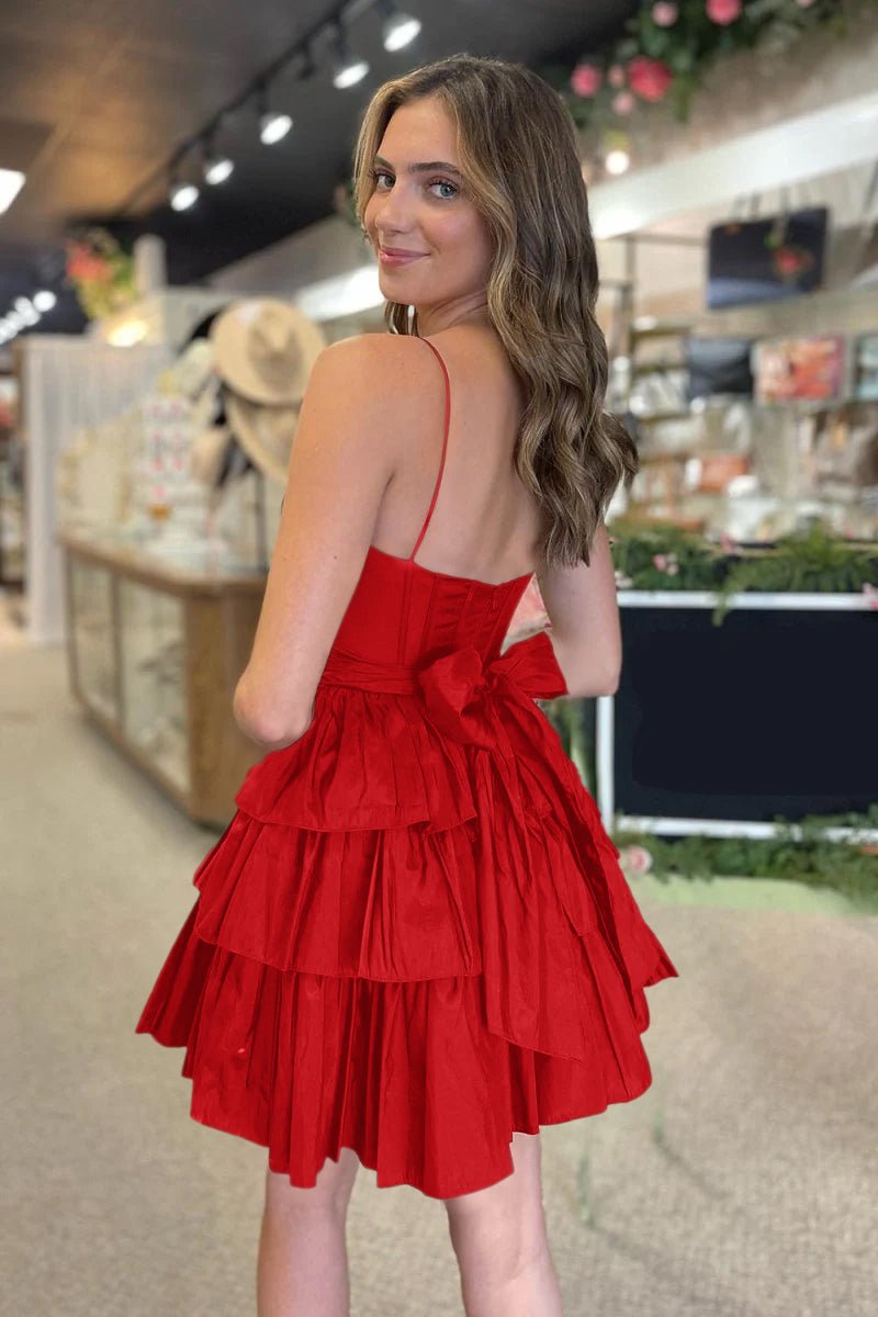 Step into elegance with our Ivilia | Black Spaghetti Straps Satin A-Line Ruffled Short Corset Homecoming Dress. This dress is crafted from luxurious satin fabric and features a flattering A-line silhouette that flows effortlessly, creating a chic and timeless look. It is available in timeless black and a fresh green hue. The square neckline adds a modern touch, while playful ruffles create a whimsical and flattering effect. The chic bow embellishment adds a touch of femininity, making this dress perfect for those who love a mix of classic and contemporary styles.