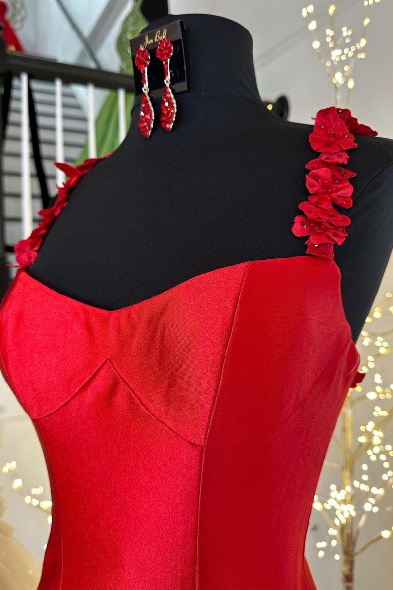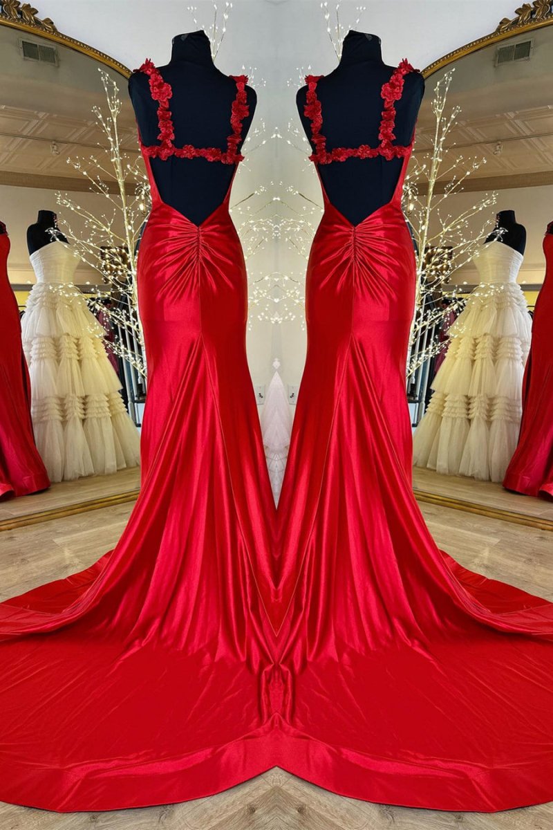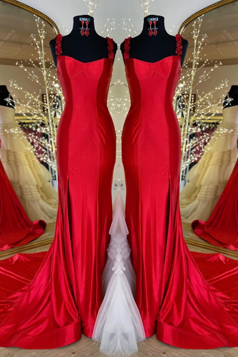 Unleash your inner goddess with the Hana | Black Straps Floral Mermaid Long Prom Dress. This stunning dress features a captivating mermaid silhouette that gracefully hugs your curves and flows into a sweep train, creating a dramatic effect as you move. The luxurious satin fabric offers a soft, elegant sheen, making it perfect for any formal occasion. It is available in classic black and vibrant red, which allows you to express your unique style. The eye-catching floral embellishments add a touch of romance, while the daring slit introduces an element of allure, giving you the confidence to make a statement. The tie-back ensures a perfect fit, allowing you to dance the night away with ease. Whether you're attending prom, a gala, or any special event, the Hana | Black Straps Floral Mermaid Long Prom Dress is the ideal choice for those seeking to turn heads and leave a lasting impression.