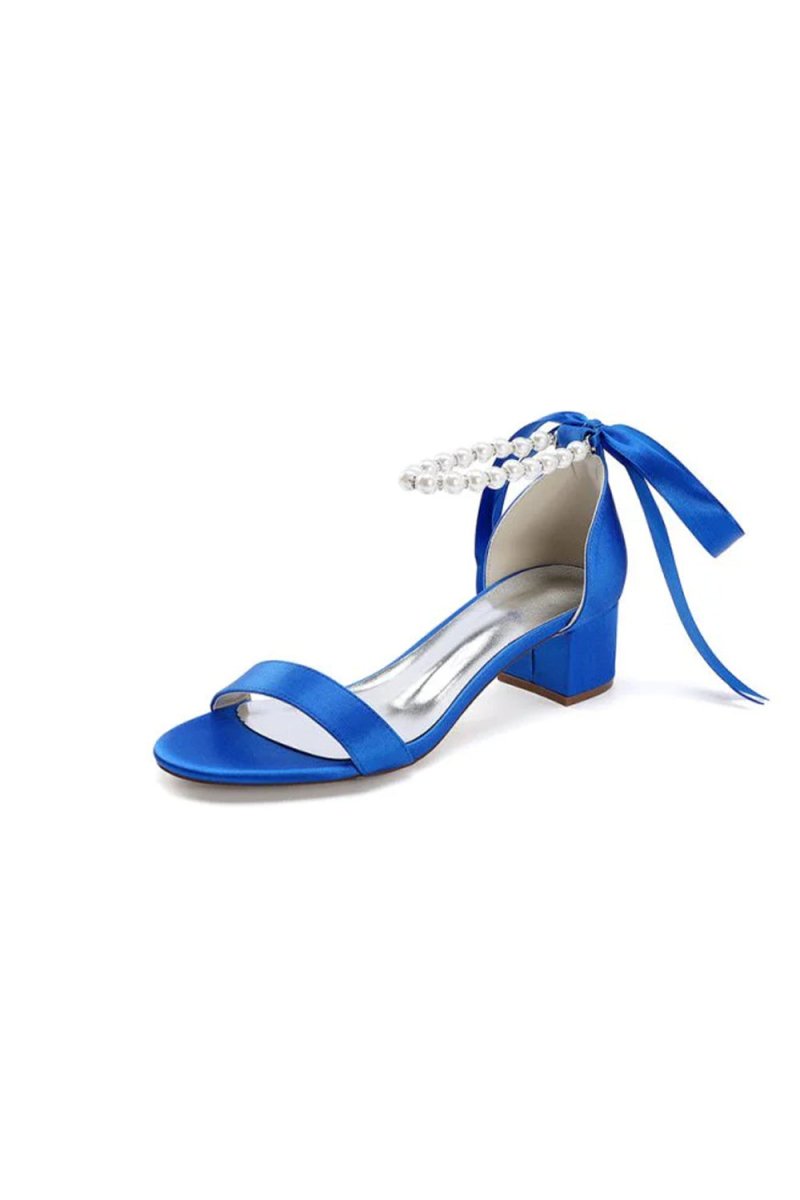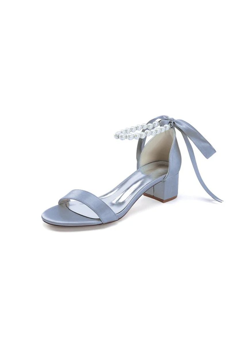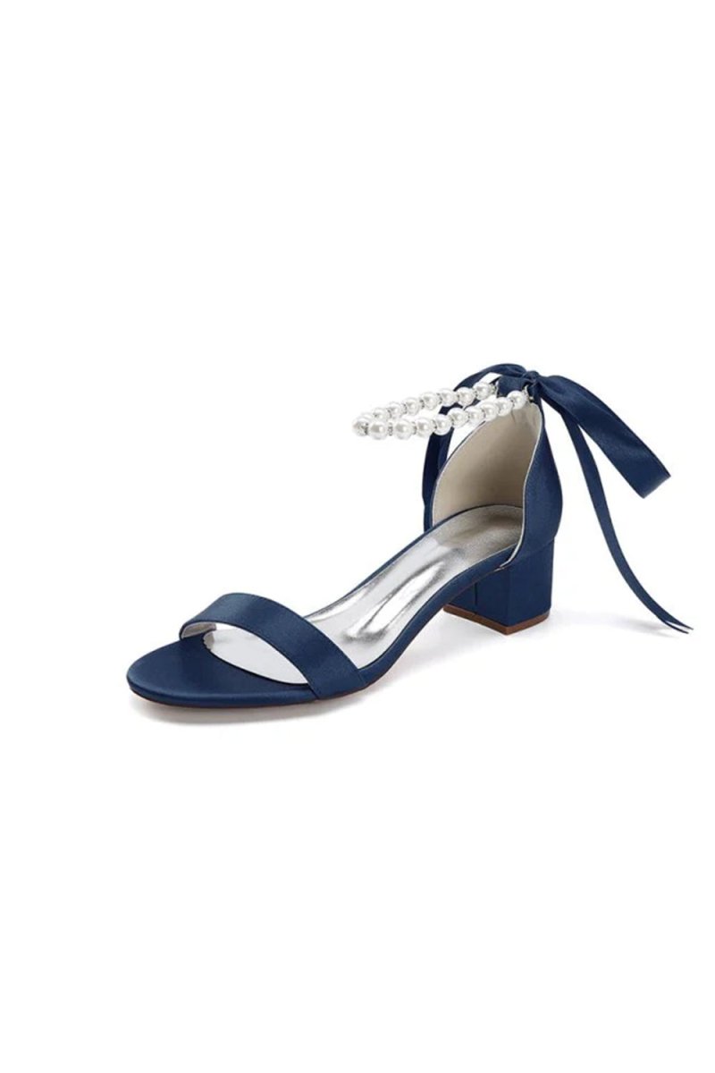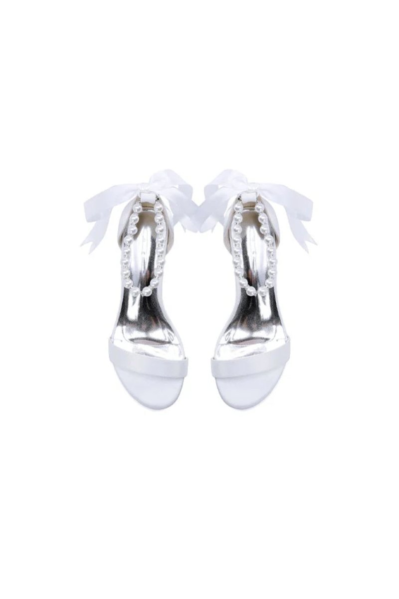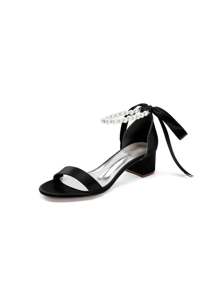 This elegant white sandal showcases a refined minimalist style, highlighted by a delicate ankle strap adorned with pearls and fastened with a graceful ribbon bow, adding a romantic touch. Made from smooth satin, it delivers a luxurious texture, while the mid-height block heel ensures comfort and stability. Its open-toe design promotes breathability, ideal for summer weddings or formal occasions. Blending classic elegance with contemporary appeal, this sandal is a perfect choice for sophisticated events.