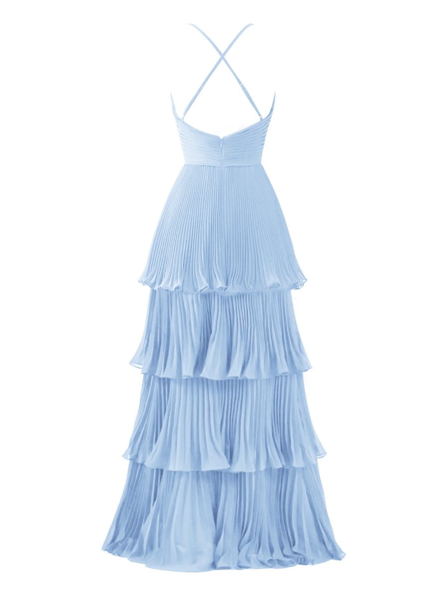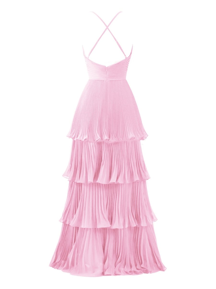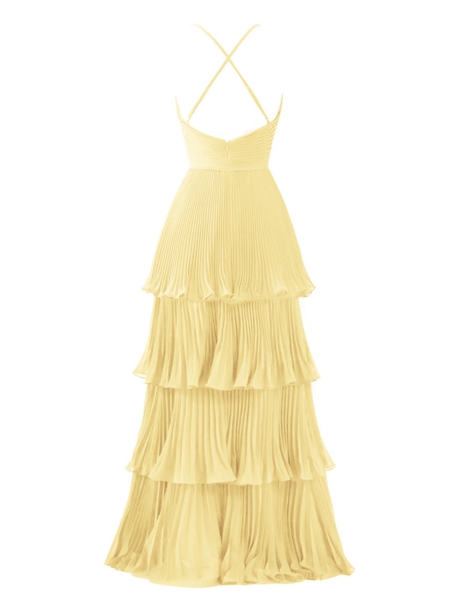 Exude grace and elegance in the Dark Green A-Line Tiered Floor Length Chiffon Bridesmaid Dress. This breathtaking gown features a flattering A-line silhouette that gracefully flows to the floor, making it a perfect choice for weddings or wedding parties. The delicate chiffon fabric drapes beautifully, while the soft pleats and multi-tiered ruffles add texture and movement with every step. A flattering spaghetti strap neckline and sleeveless design create a timeless, feminine look. The back features a secure zipper closure for a seamless fit. Available in both a rich green and elegant burgundy, this dress is designed to make your bridesmaids feel effortlessly chic and comfortable on the big day.