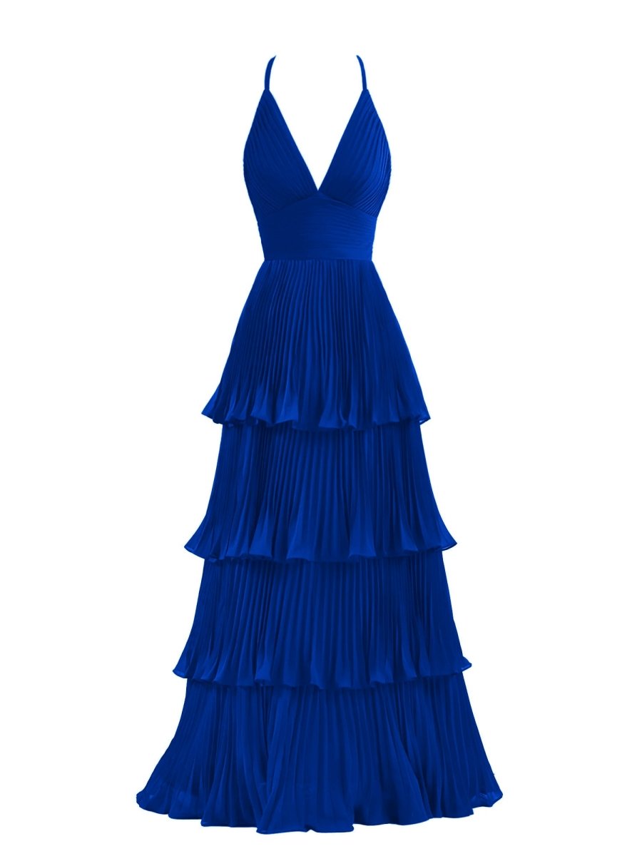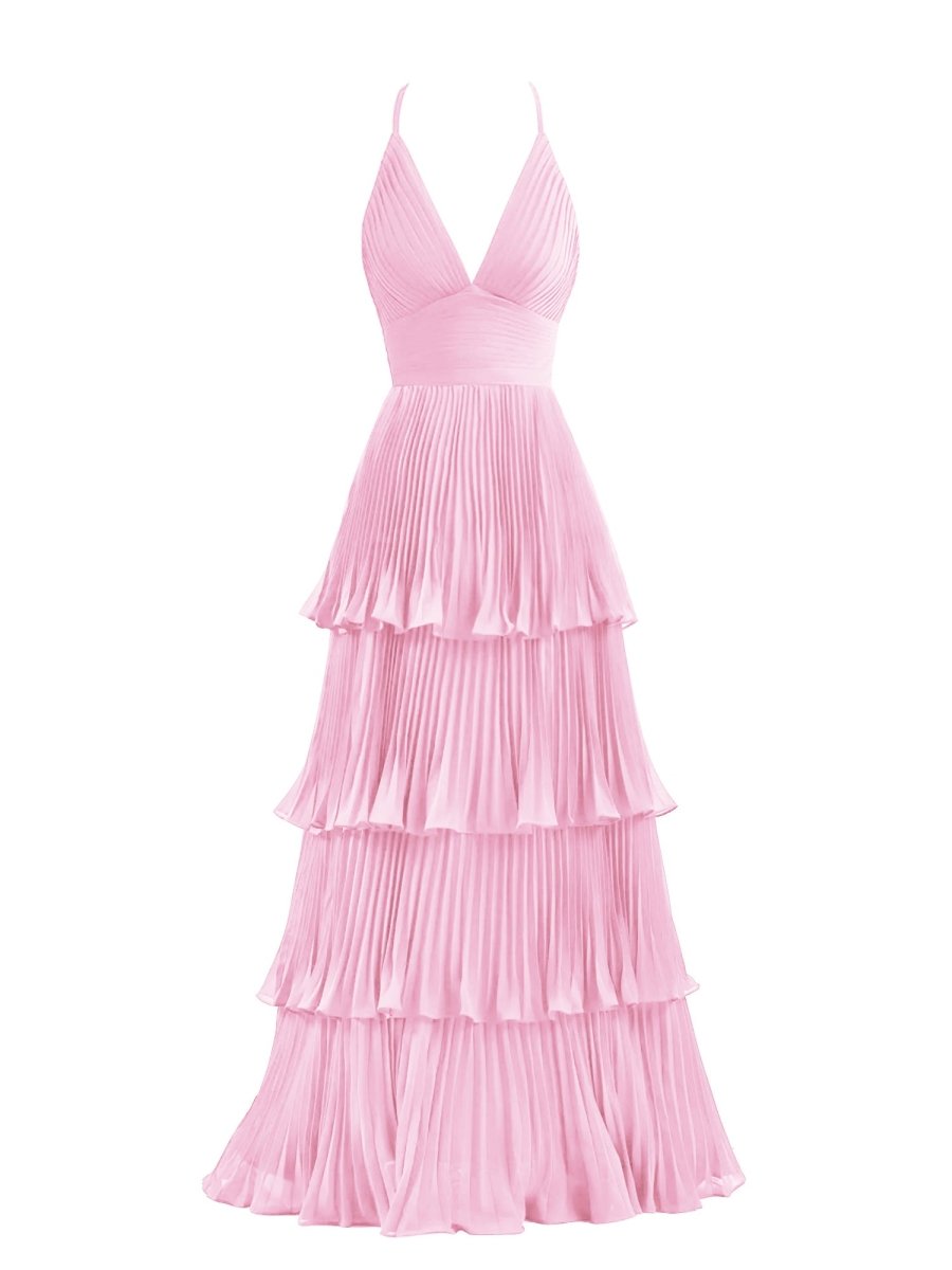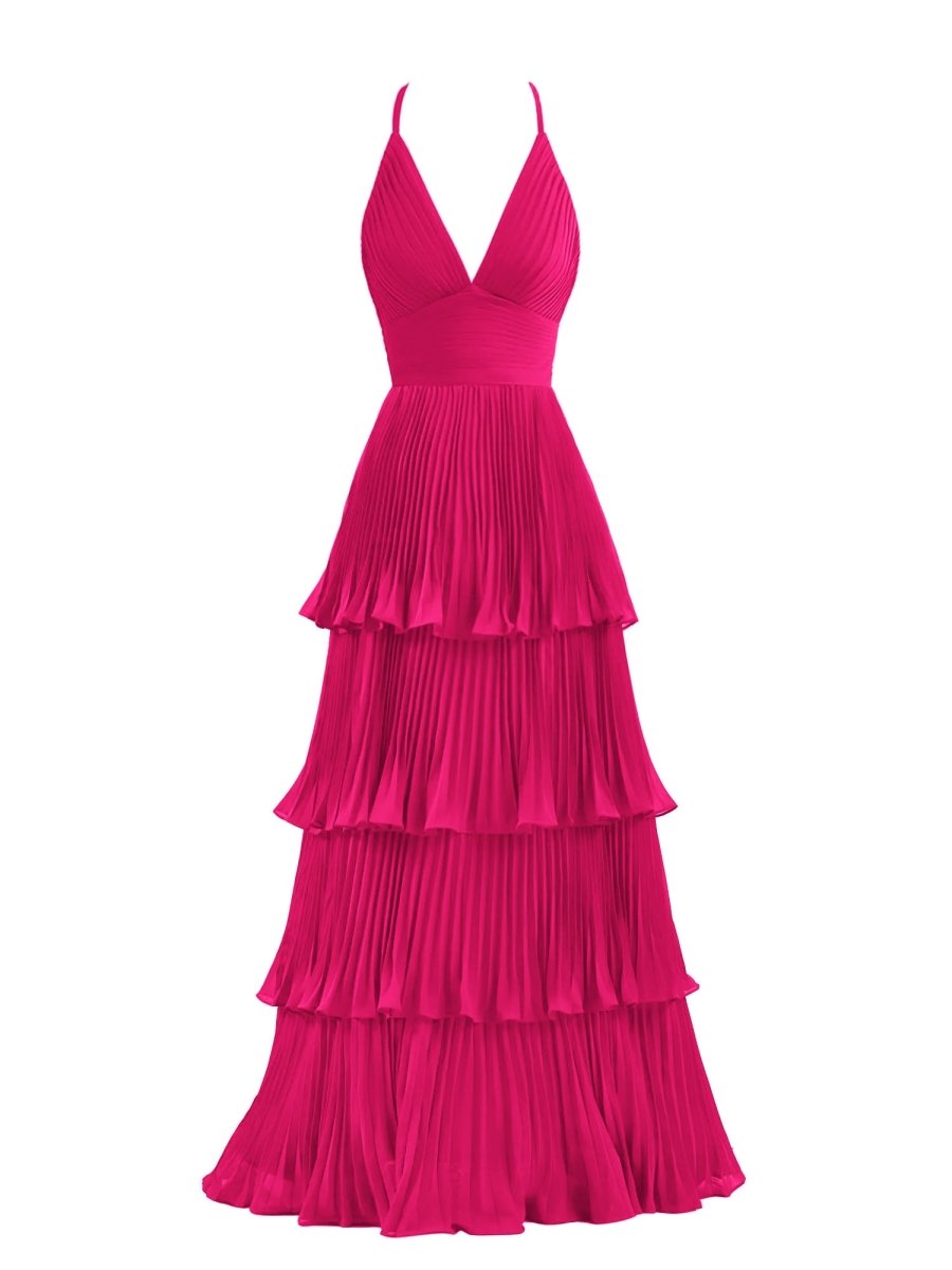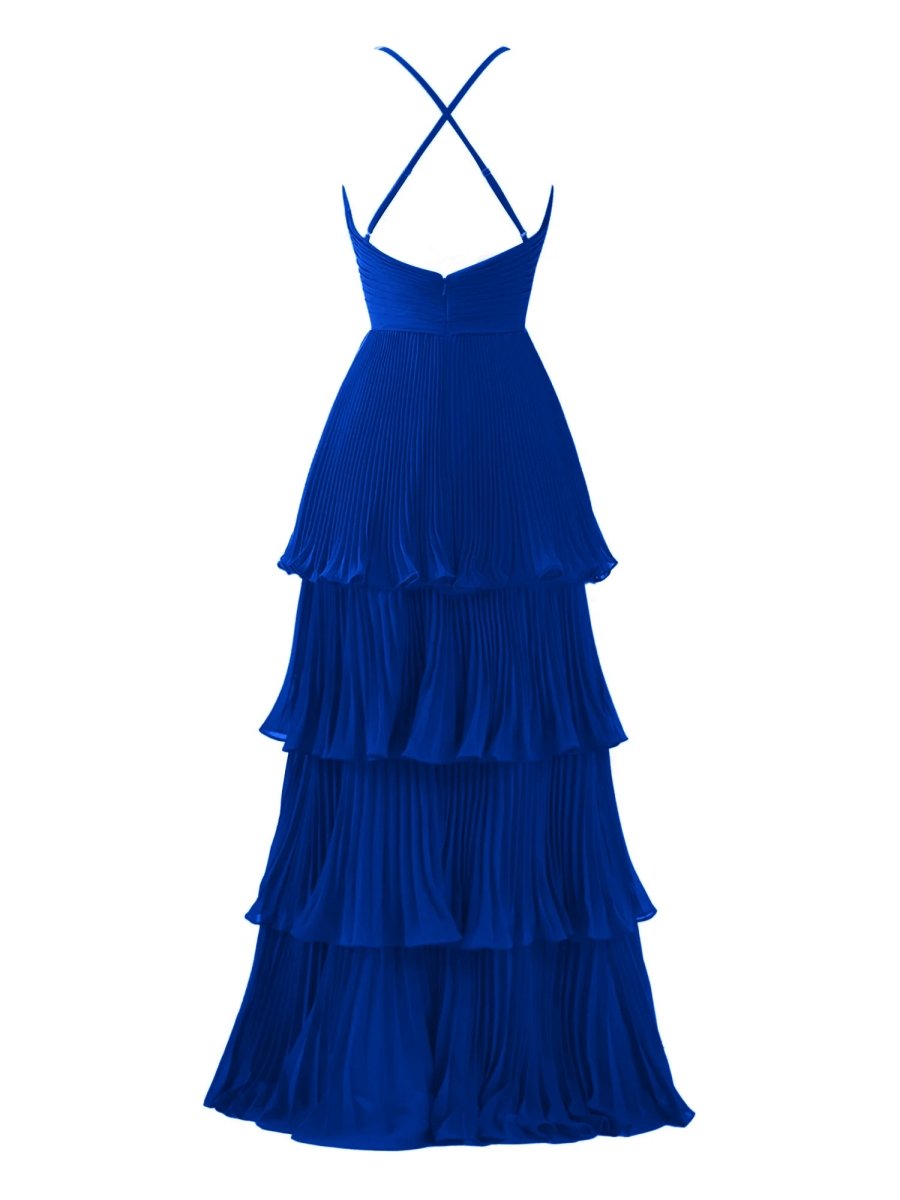 Exude grace and elegance in the Dark Green A-Line Tiered Floor Length Chiffon Bridesmaid Dress. This breathtaking gown features a flattering A-line silhouette that gracefully flows to the floor, making it a perfect choice for weddings or wedding parties. The delicate chiffon fabric drapes beautifully, while the soft pleats and multi-tiered ruffles add texture and movement with every step. A flattering spaghetti strap neckline and sleeveless design create a timeless, feminine look. The back features a secure zipper closure for a seamless fit. Available in both a rich green and elegant burgundy, this dress is designed to make your bridesmaids feel effortlessly chic and comfortable on the big day.