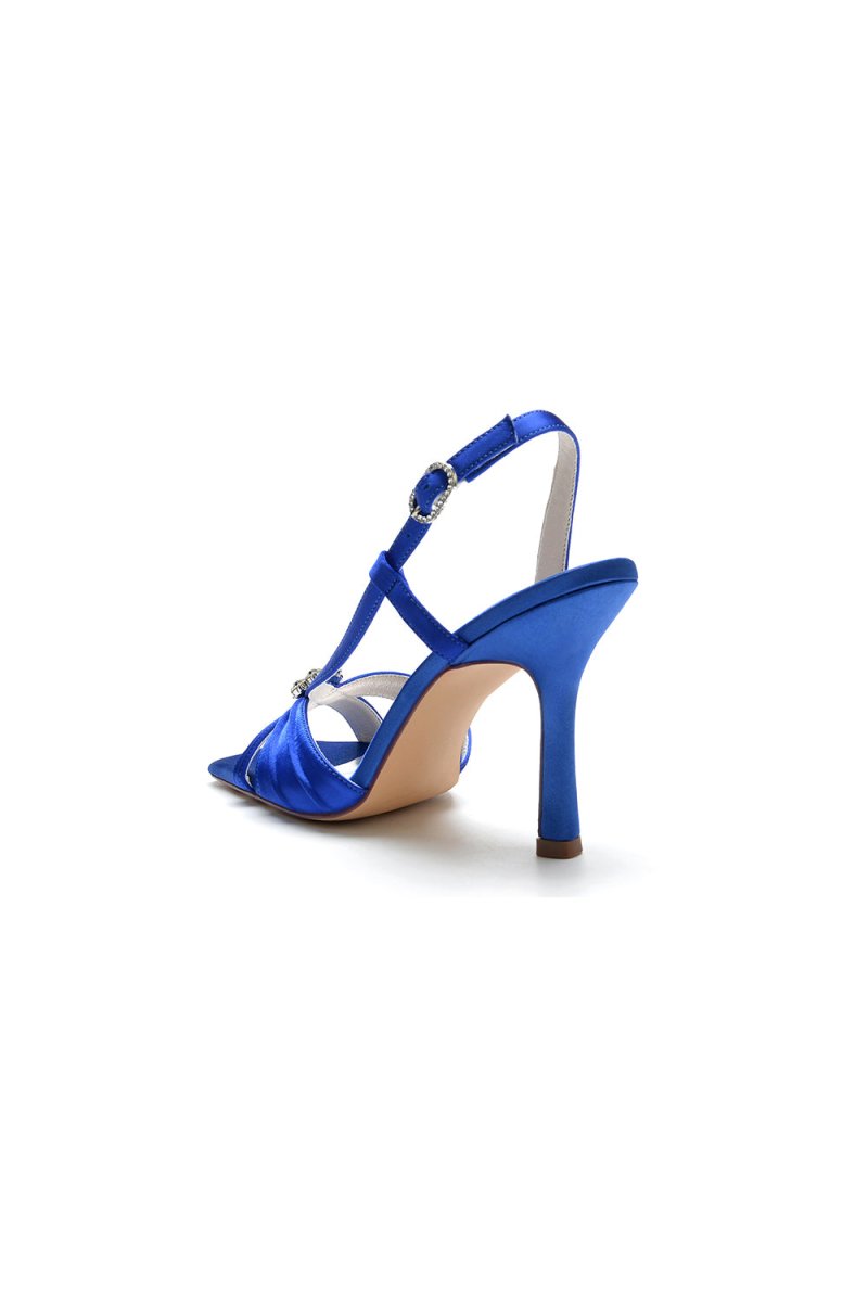 Make a statement on any occasion with these stunning blue satin stiletto heels. Adorned with dazzling silver crystal embellishments, these elegant heels are perfect for prom shoes, wedding shoes, or a chic party look. The open-toe design and slip-on closure offer both comfort and style, making them an ideal choice for bridesmaid shoes or evening events.