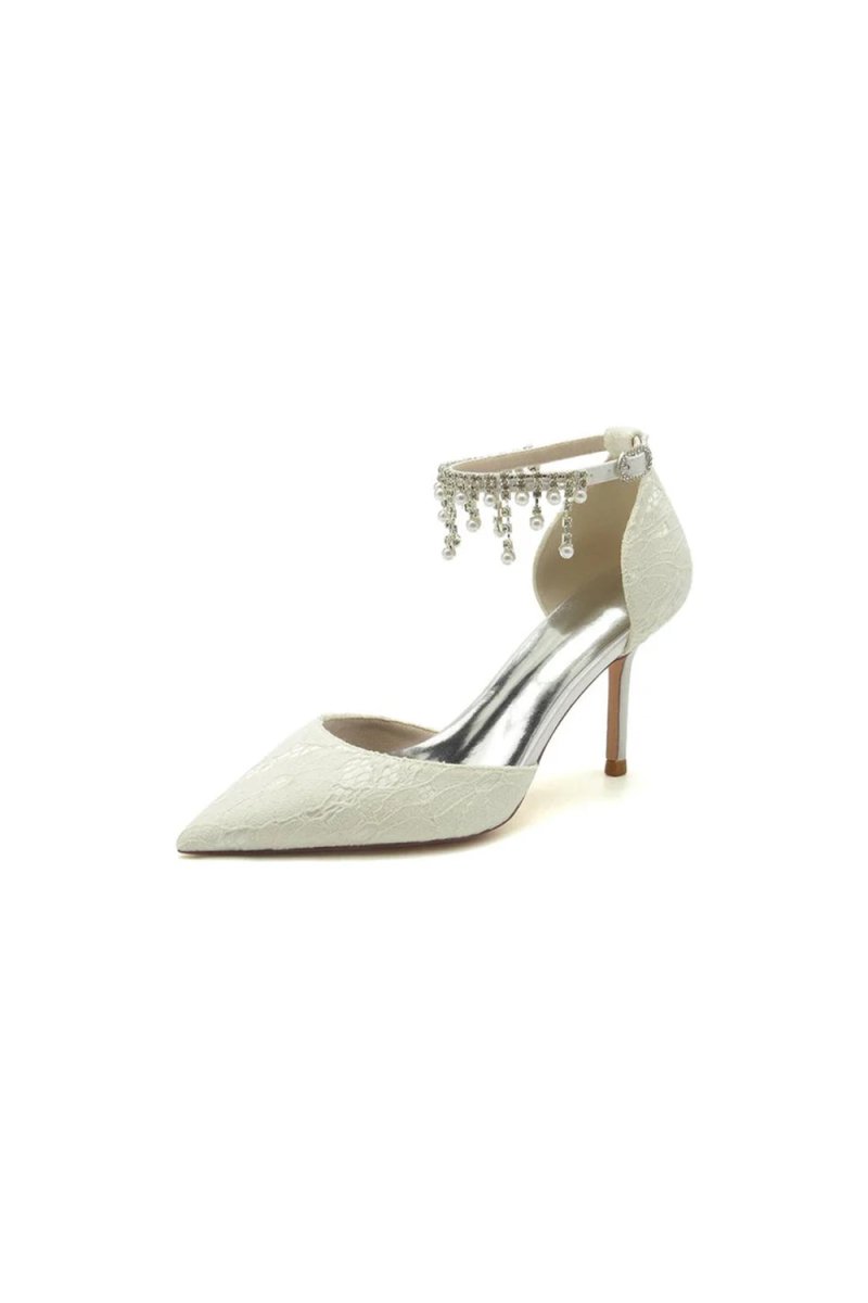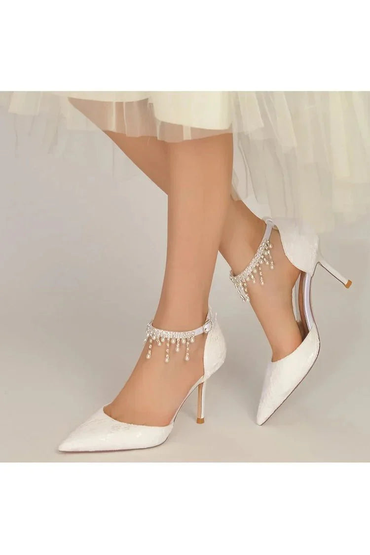 Step into elegance and sophistication with Elegant White Ankle Strap Pearl Beaded Wedding Shoes. These shoes feature delicate pearl bead embellishments that add a touch of timeless beauty, designed for the bride who wants to shine on her special day. The pointed toe design creates a sleek, feminine silhouette, while the stiletto heels provide the perfect balance of height and grace. Whether you're walking down the aisle or celebrating at a prom, these wedding shoes are sure to make a statement.