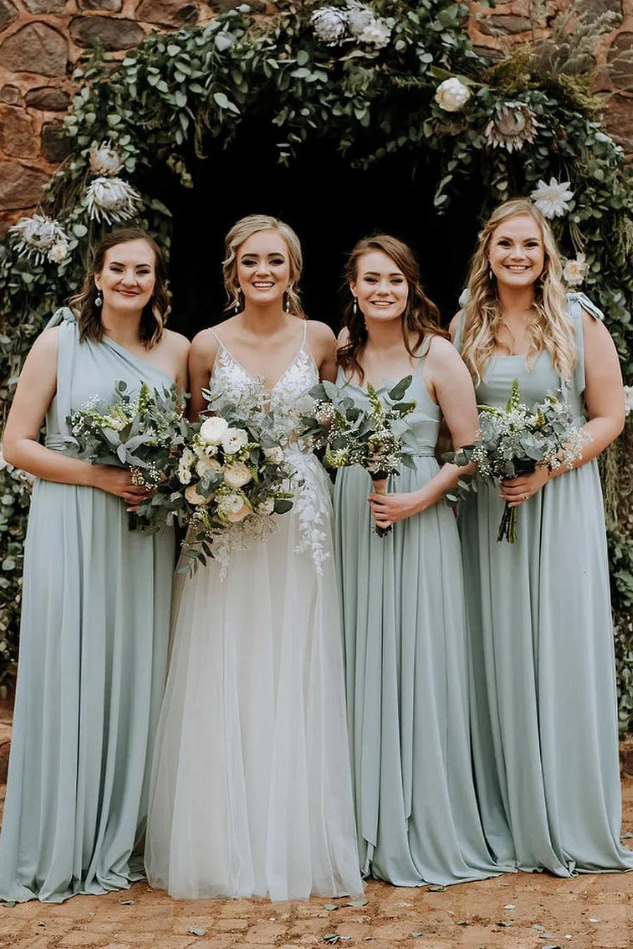 The Grey Green Chiffon Spaghetti Straps A-Line Long Bridesmaid Dress is an exquisite blend of grace and modern sophistication, perfect for bridesmaids seeking elegance with a touch of uniqueness. This dress features an A-line silhouette that flows beautifully, skimming the body in a flattering way while allowing ease of movement. The soft chiffon fabric drapes elegantly, creating a light, airy effect perfect for formal weddings or special events.The one-shoulder neckline, combined with the subtle scoop neckline, provides a contemporary twist on classic bridal party attire, highlighting the collarbone and shoulders for a refined look. The dress’s grey green color is both calming and sophisticated, ideal for both spring and fall weddings.