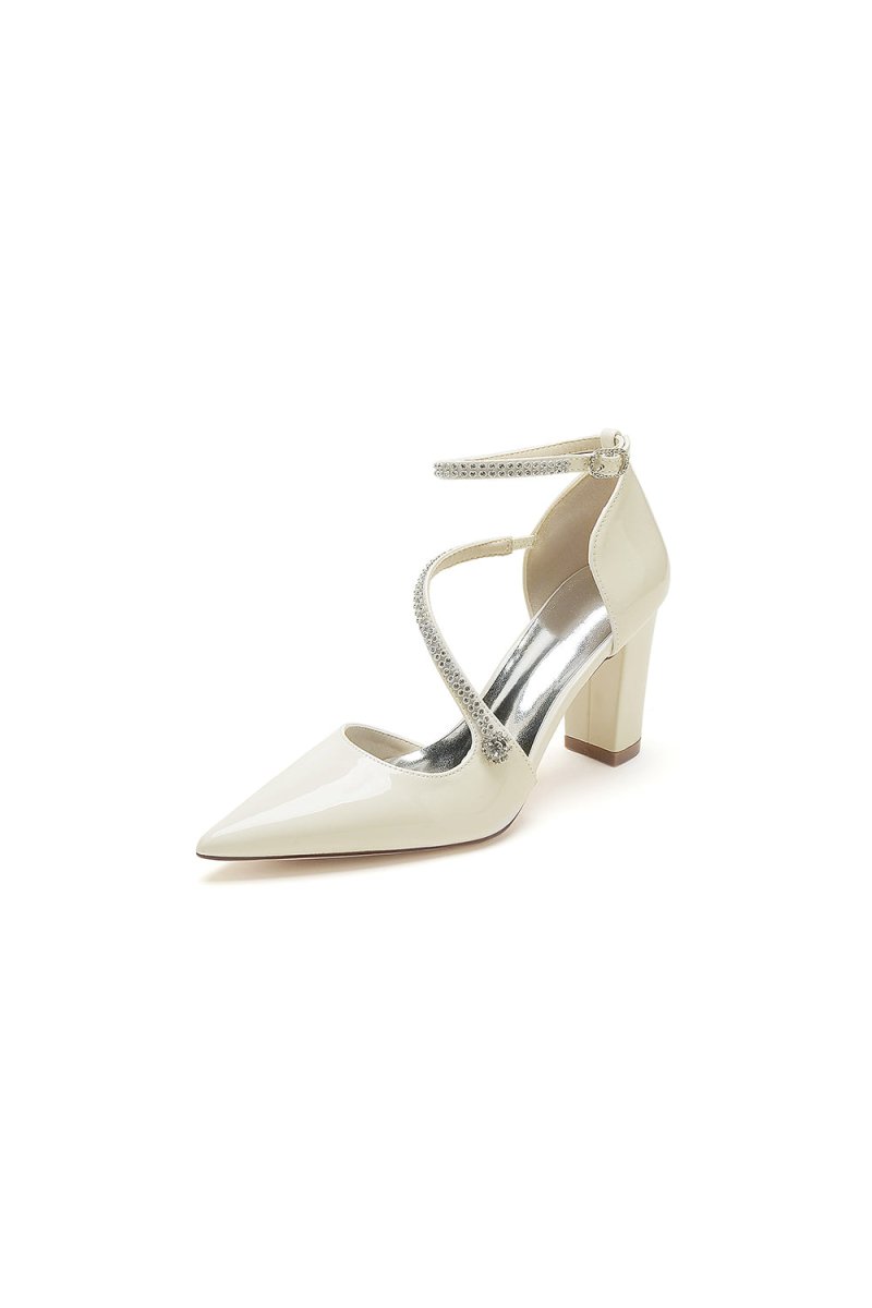 Experience true elegance with these stunning ivory high heels. Made with a sleek and glossy material, these shoes boast a pointed toe design that adds a modern and sophisticated touch to any ensemble. A silver chain running across the vamp adds a striking and stylish element to the design, perfectly complementing the ivory hue. To further enhance the luxurious feel, the chain detailing seamlessly matches the color of the shoes. A beautiful gem-like embellishment at the heel catches the light just right, adding a touch of sparkle and shine to the overall appearance. The sturdy heel provides excellent support and stability, while its elegant design adds to the refined aesthetic of the shoes. Complete your wardrobe with these must-have ivory high heels that exude sophistication and high-end fashion, perfect for any special occasion or formal event.