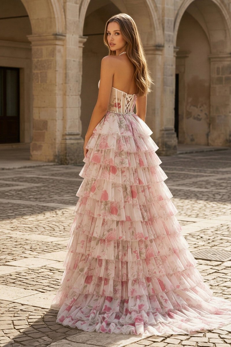 Crafted from lightweight floral tulle, the dress offers both structure and softness. The lace-up back allows for an adjustable, tailored fit, and the layered ruffle skirt gives the gown dimension and gentle movement. Finished with subtle bead accents, Inari is an ideal choice for prom, formal dances, evening celebrations, and other special events.