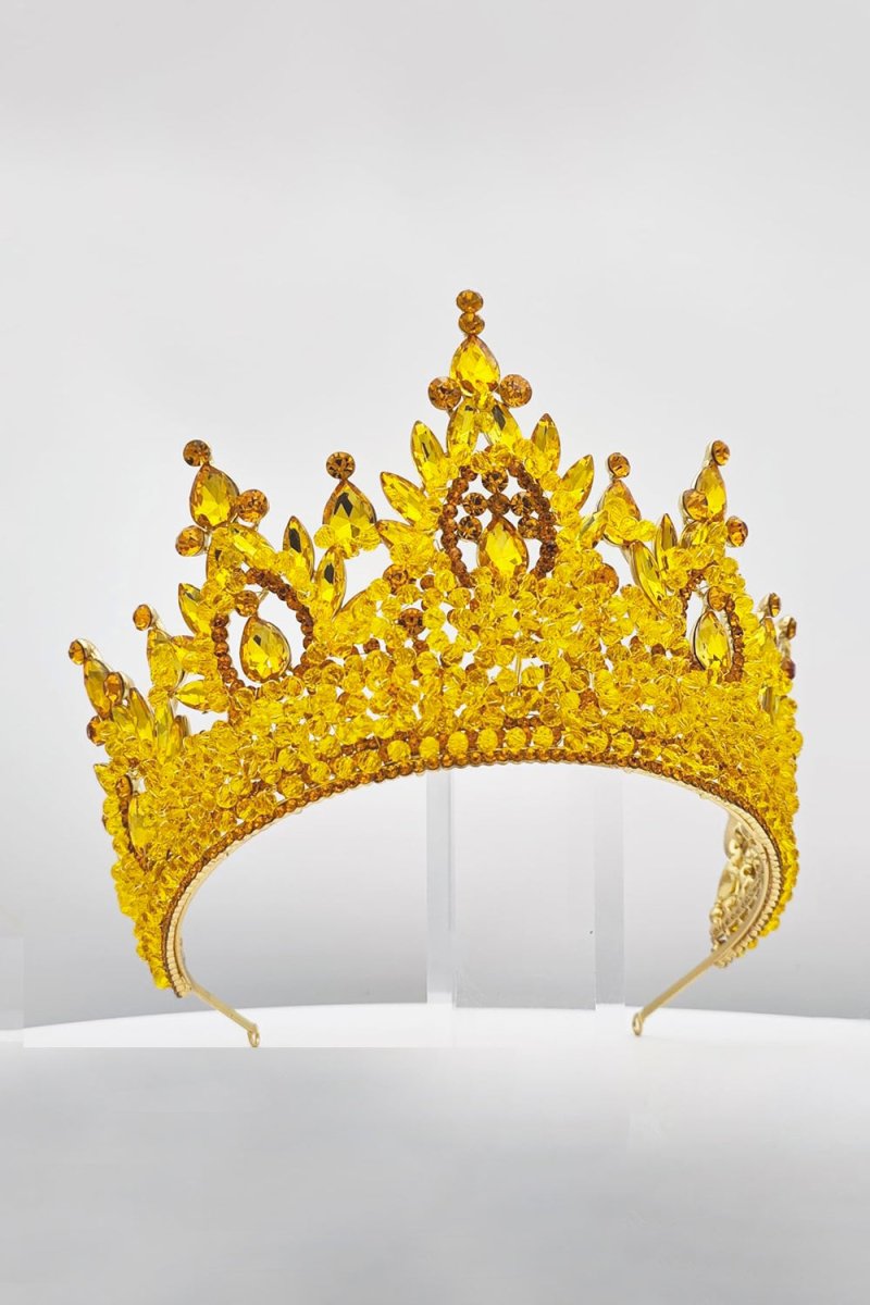 The rhinestone queen's crown features gemstones, each one sparkling brilliantly to create a mesmerizing, regal effect. Its intricate design combines various hues, adding depth and vibrancy to the crown, making it the perfect accessory for a princess with a bold, majestic presence.