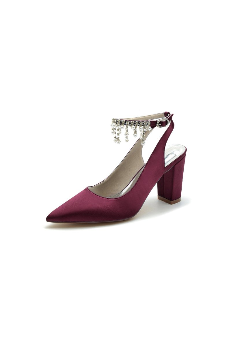 Step out in style with these Pointed Toe Satin Chunky Heels. The elegant design features a pointed toe, perfect for adding a touch of sophistication to any outfit. The chunky heel provides stability and comfort, while the pearl tassel detail adds a unique flair. Whether you're attending prom or a wedding, these shoes are perfect for bridal shoes or evening shoes for any special event.