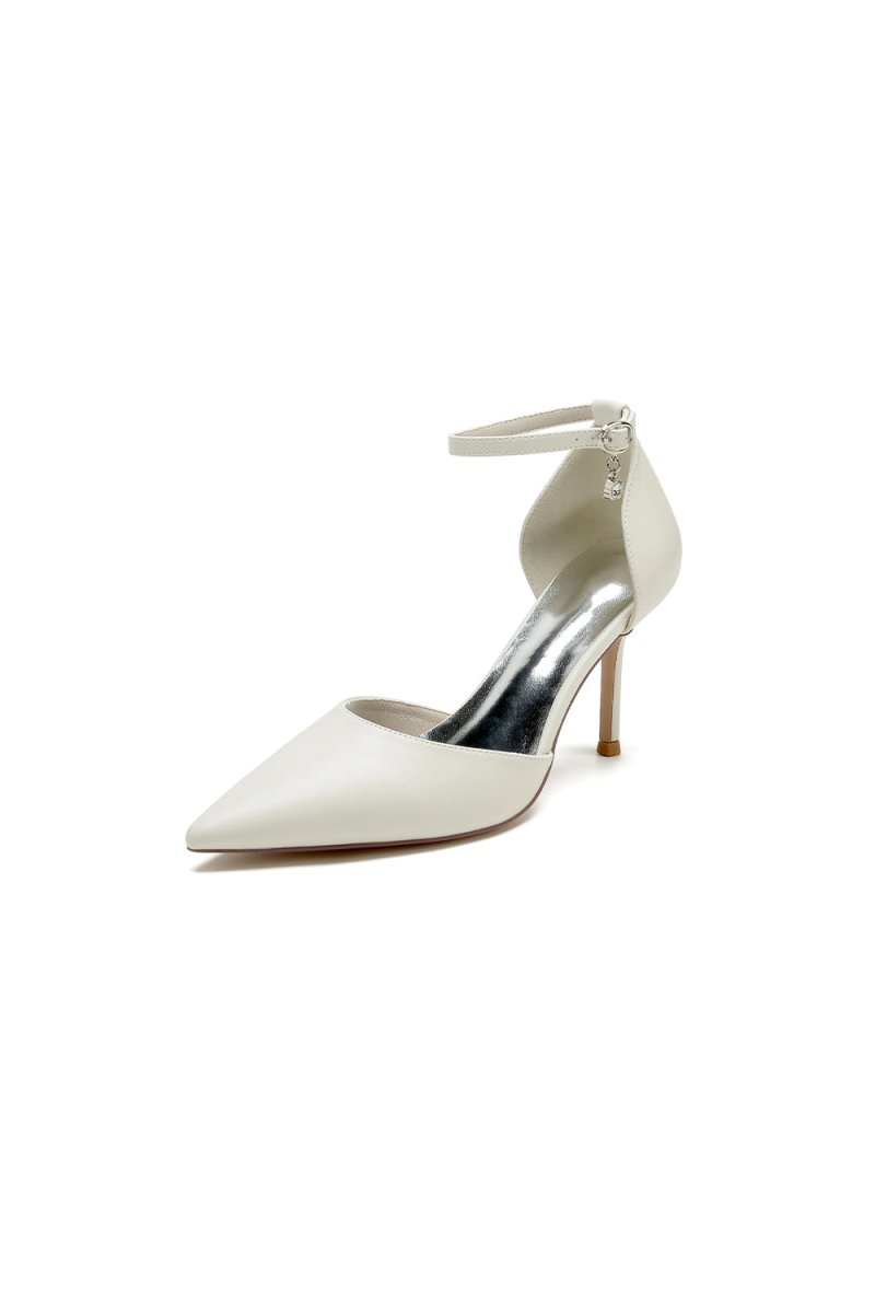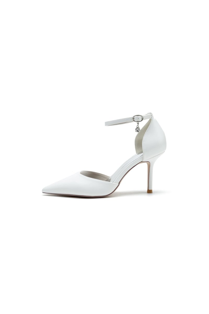 Step into elegance with white satin wedding shoes, featuring a sleek pointed toe and a secure ankle strap. The stiletto heels add a striking 8.5cm lift, creating a bold yet graceful silhouette. These shoes combine classic style with modern sophistication, perfect for both weddings and proms. Crafted with a rubber sole and imitation pigskin lining, they offer both comfort and durability. Ideal for brides and bridesmaids seeking a chic, timeless look.