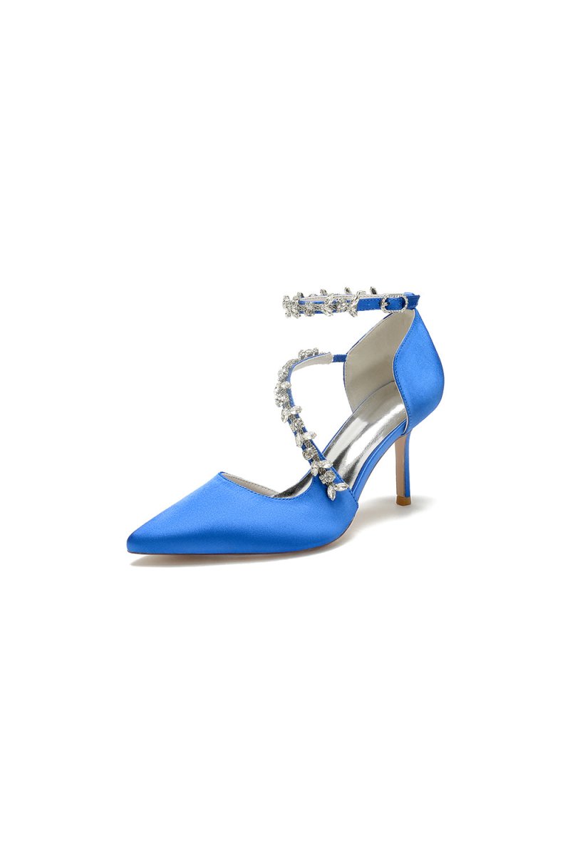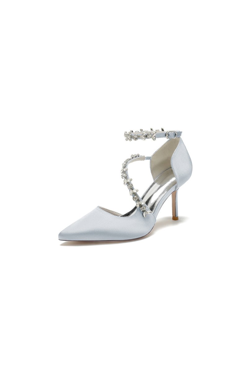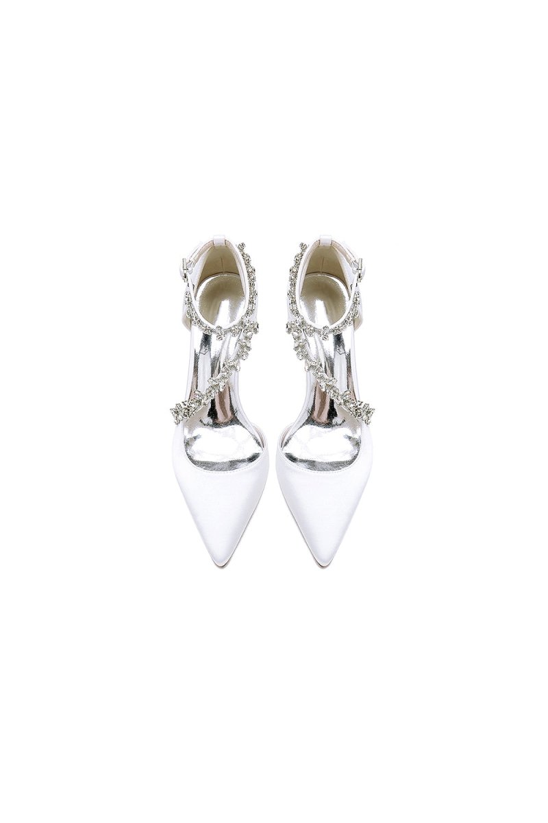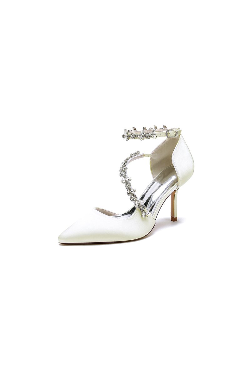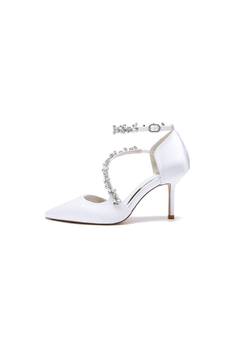Complete your bridal look with Pointed Toe Slingback Strap High Heels. The crystal embellishment adds an elegant touch while the stiletto heel provides a flattering 8.5 cm lift. The slingback strap ensures a secure fit while the pointed toe and rubber lining offer both style and comfort. Perfect for any wedding occasion.