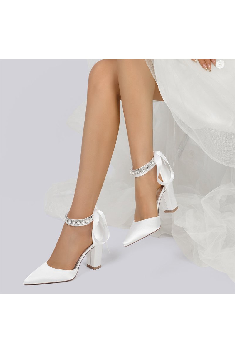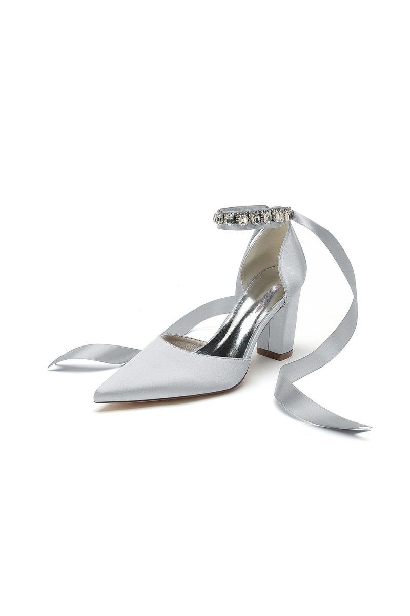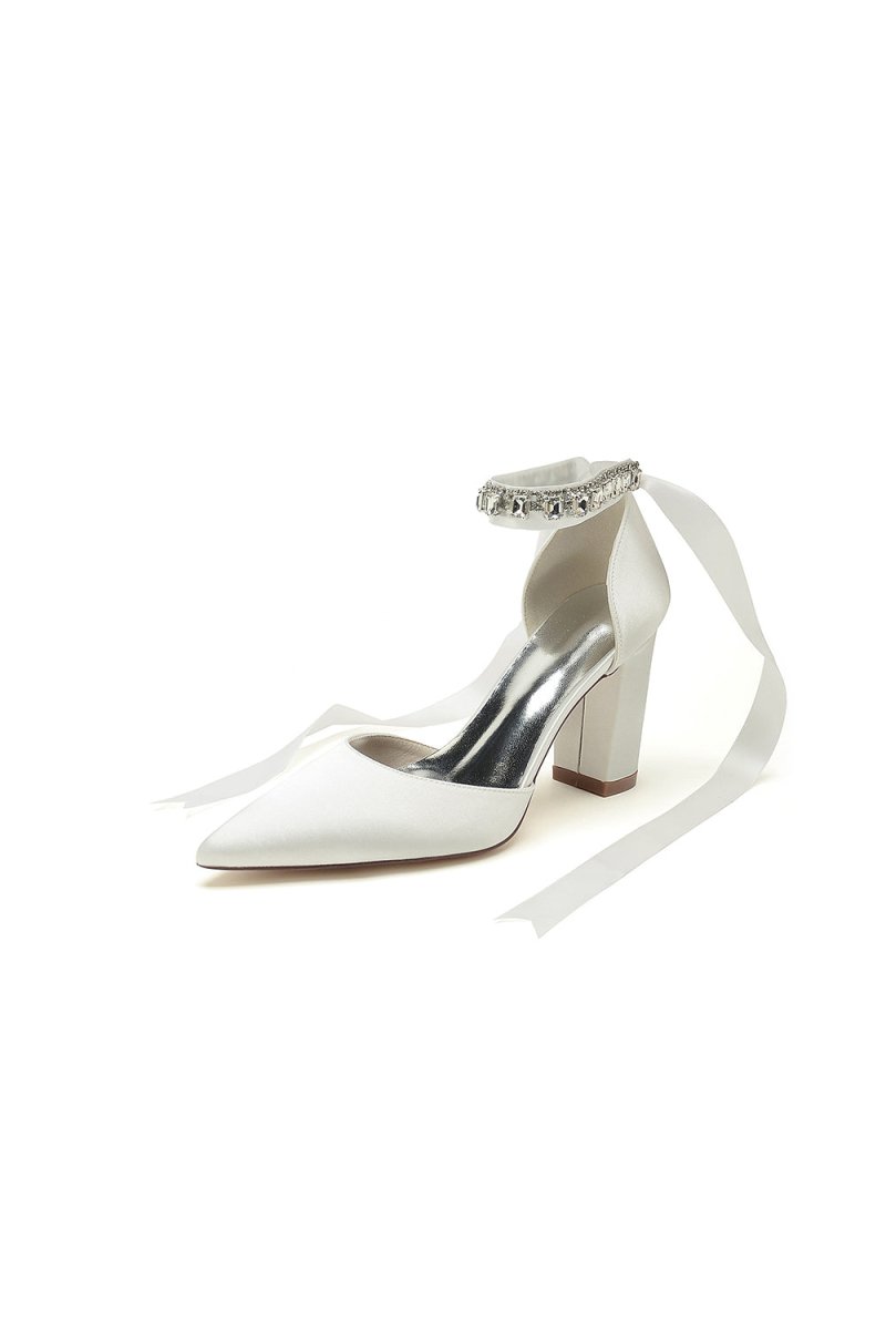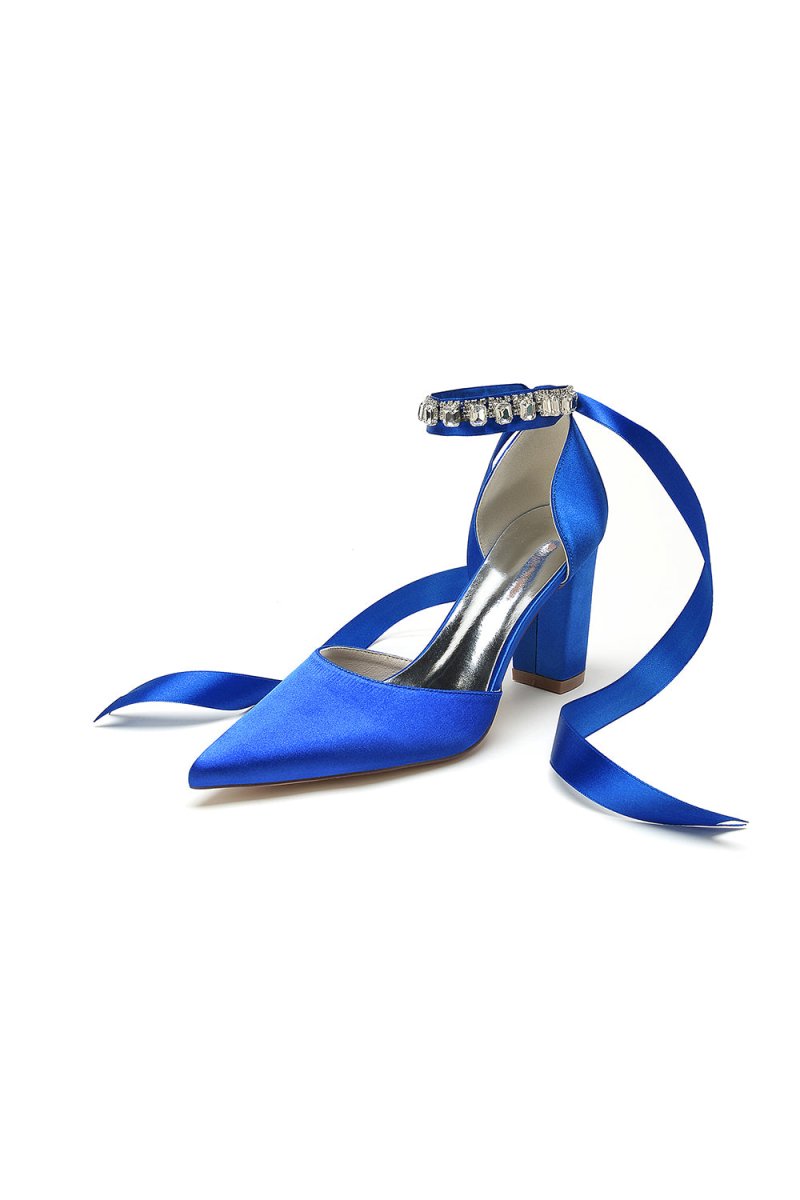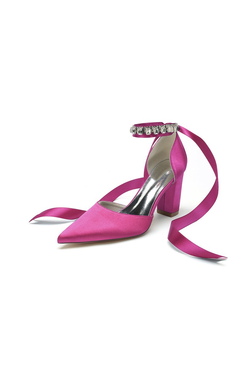 Add sparkle to your special occasion with these rhinestone-embellished heels. These chunky heels offer both style and comfort, perfect for prom, wedding, or evening shoes. The pointed toe and ankle strap ensures a secure fit, while the 8.5 cm heel gives you a touch of height. Made from satin with elegant rhinestone detailing, these heels are a showstopper, a stunning choice for party shoes, bridesmaid shoes, or any occasion.