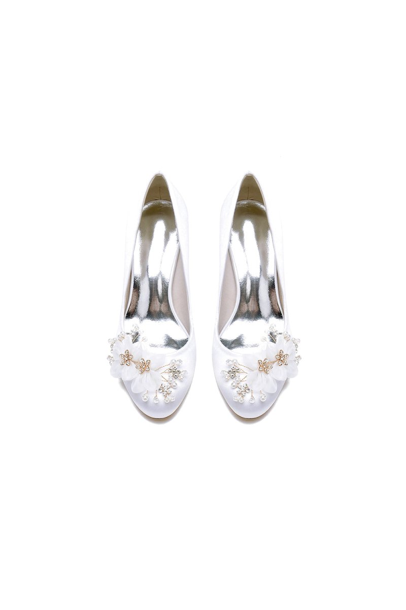 Elevate your wedding day look with Rhinestone White Chunky Heels. The striking flower embellishment and stiletto heel make for a glamorous and comfortable choice. Featuring a rubber sole and imitation pigskin lining, these pointed toe heels are a must-have for any bride-to-be.