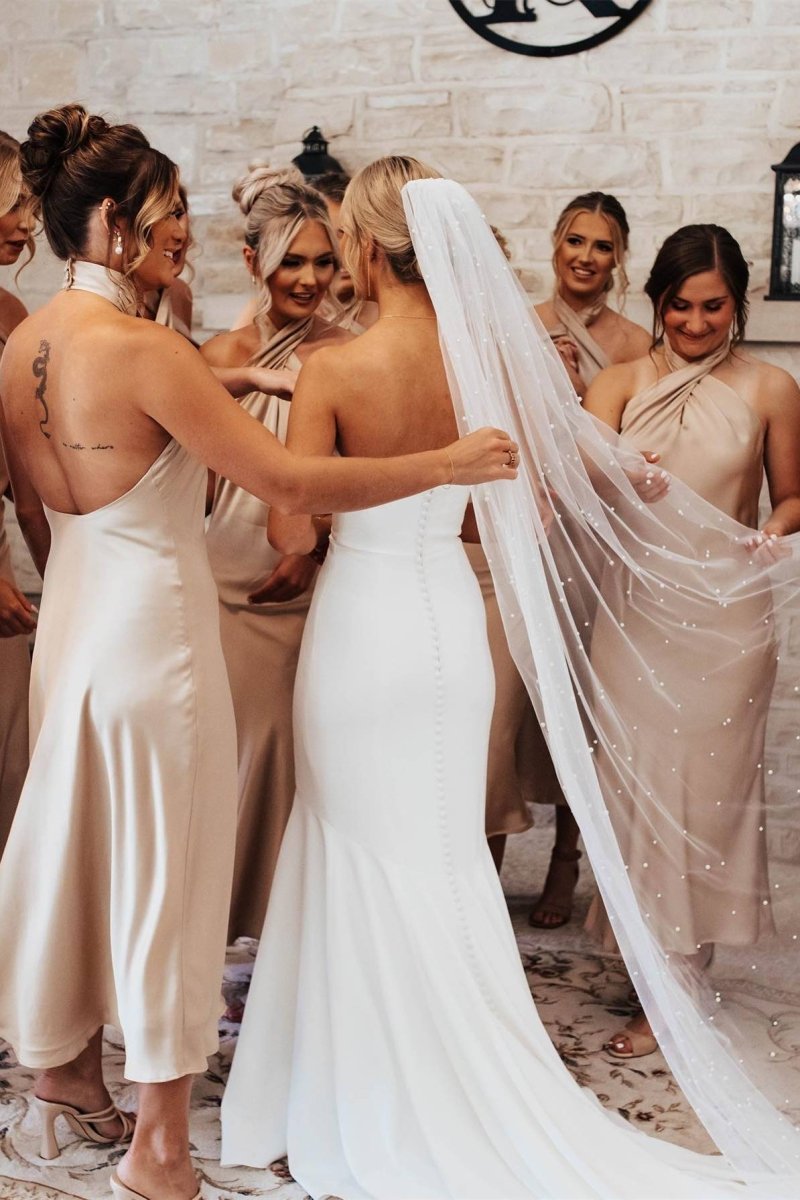 This elegant dress strikes the perfect balance between sophistication and modern style. The sheath silhouette hugs the body in all the right places, creating a sleek and flattering shape that enhances your natural curves. The soft sage green color exudes a fresh and serene vibe, making it perfect for bridesmaids, wedding guests, or any special occasion. Crafted from luxurious satin fabric, the dress has a smooth, lustrous finish that catches the light beautifully. The halter neckline adds a touch of bold elegance, framing the face and shoulders while offering a flattering and chic look. With a sleeveless design, this dress ensures comfort and freedom of movement, ideal for both formal indoor and outdoor events. The lace-up back provides a customizable fit, ensuring you feel both secure and comfortable throughout the day or evening. Pleated detailing at the skirt adds depth and texture, bringing an element of sophistication and visual interest to the dress.