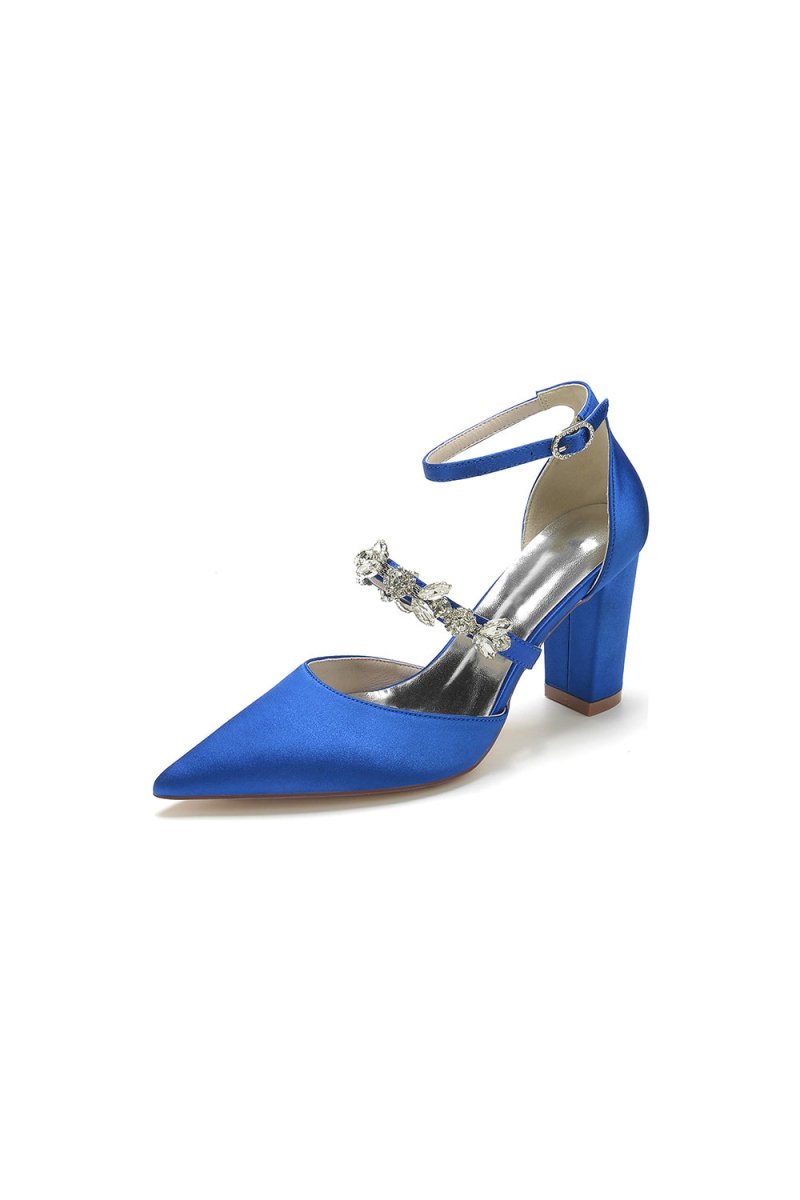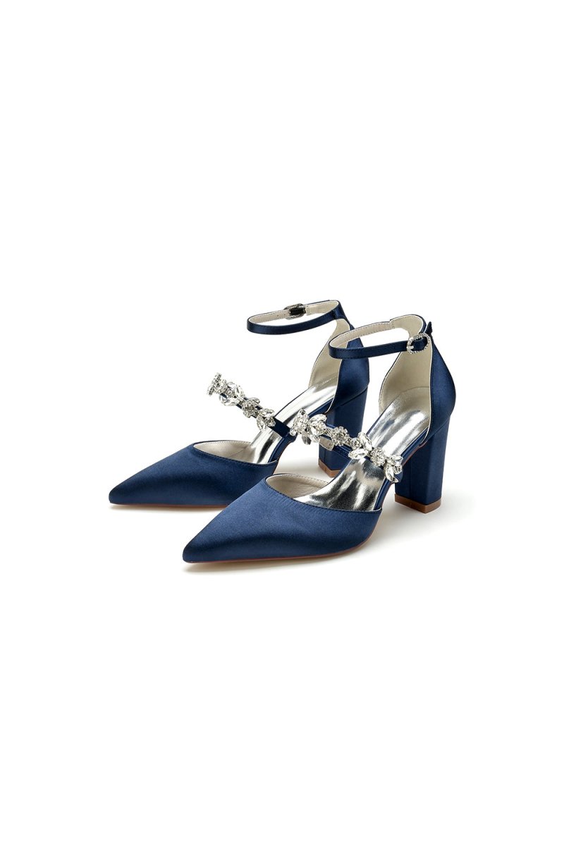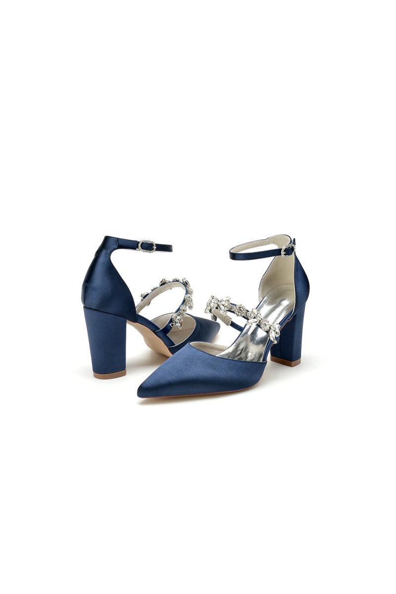Experience the perfect blend of elegance and comfort with our Satin Pointed Toe Rhinestone Strappy Chunky Heels. The sleek satin material and pointed toe design give a sophisticated appeal while the rhinestone straps add a touch of sparkle. The chunky heels provide stability and support for all-day wear. Whether for your wedding or prom, these shoes are perfect as bridal shoes or evening shoes for an elegant look.