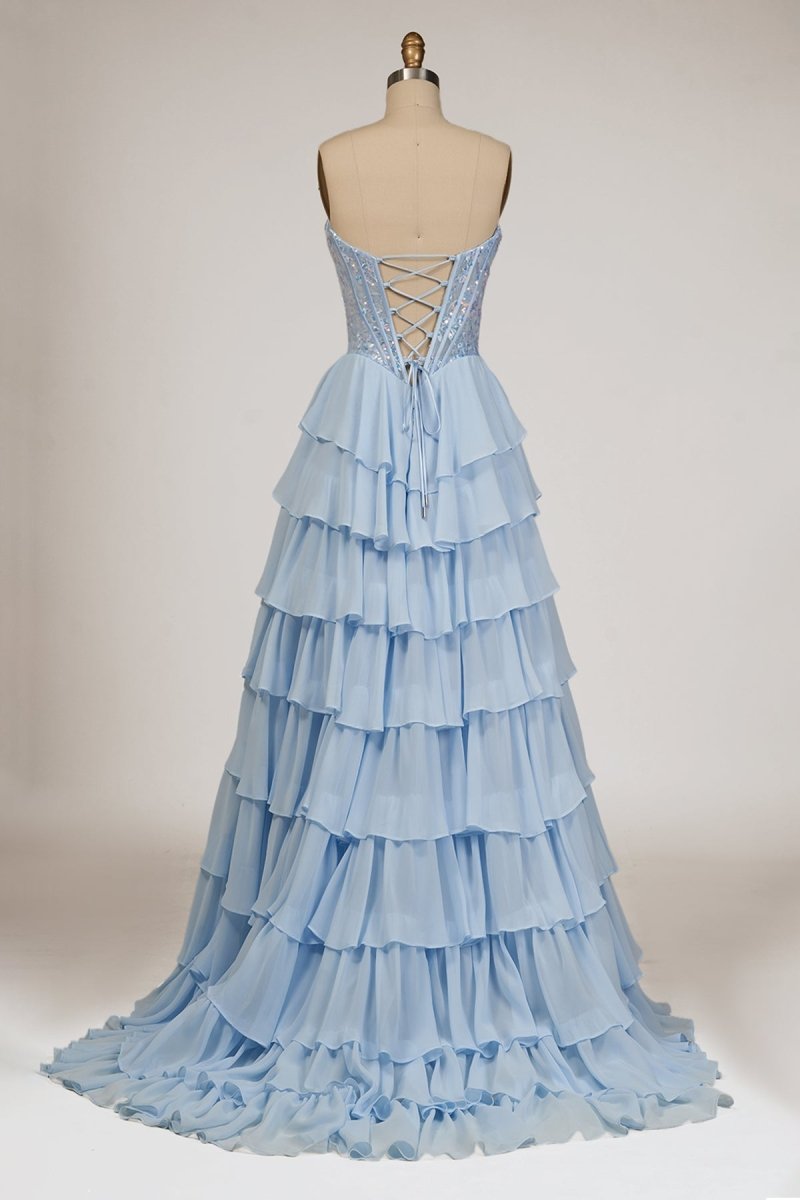 Maravelle is a sparkling and elegant choice from our evening dresses collection. Her flowing A-line silhouette in soft chiffon is enhanced with delicate ruffles and shimmering sequins, creating a glamorous yet graceful look. A subtle slit adds movement and allure, while the strapless neckline and lace-up back provide a flattering, adjustable fit. Perfect for prom nights or formal occasions, Maravelle stands out among formal dresses with her radiant and feminine charm.