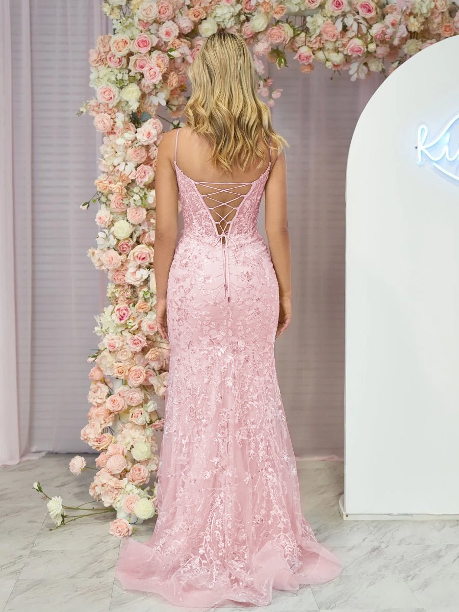 Make a stunning entrance in this breathtaking mermaid-style gown, crafted from delicate lace fabric in a soft sky blue color. The V-neck and sleeveless design offer a refined and timeless look, while the figure-hugging silhouette accentuates your curves before flowing into a dramatic sweep train. The intricate appliqué embellishments add a touch of elegance and texture, making this gown truly unique. With a zipper back ensuring a perfect fit, this gown combines comfort with sophistication, making it the perfect choice for both evening dresses and formal dresses, where you want to turn heads and leave a lasting impression!