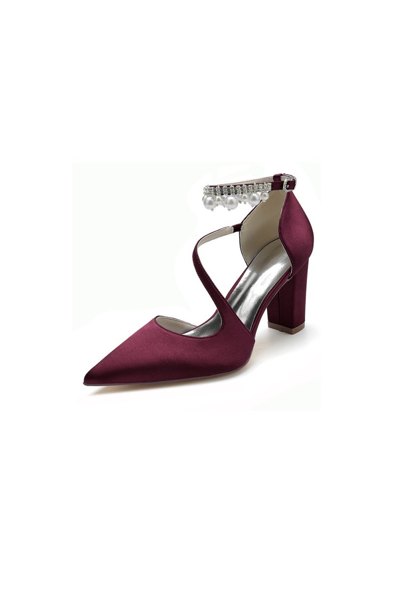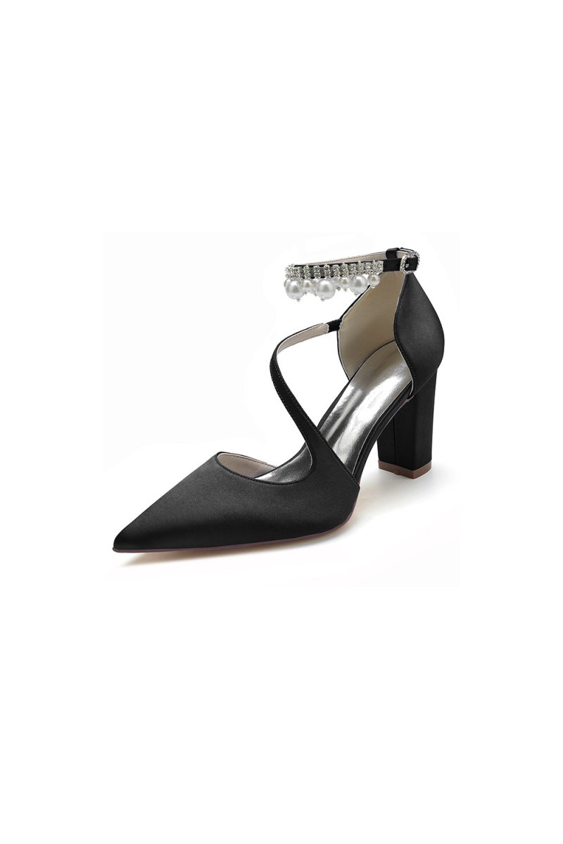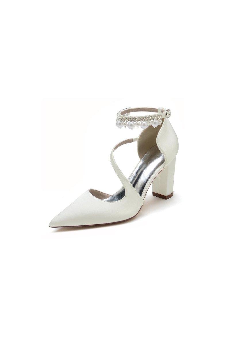 Elevate your style with these elegant White Satin Heels featuring a sophisticated cross-strap design and pearl-accented buckle. Perfect for prom shoes, wedding shoes, evening shoes, party shoes, and bridesmaid shoes, these chunky heels with a pointed toe offer a timeless look for any occasion. Crafted with satin fabric, artificial leather lining, and a rubber sole, they provide comfort and style all night long.