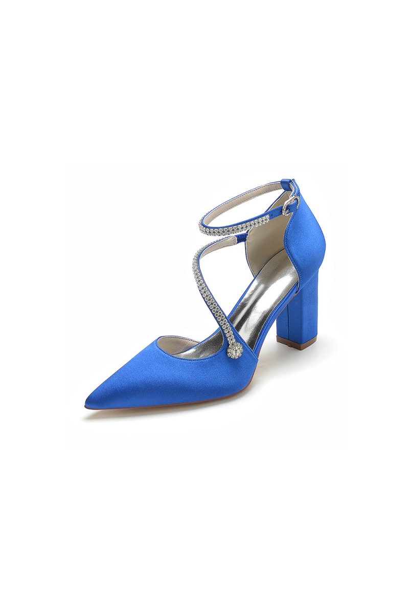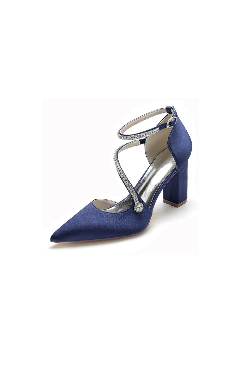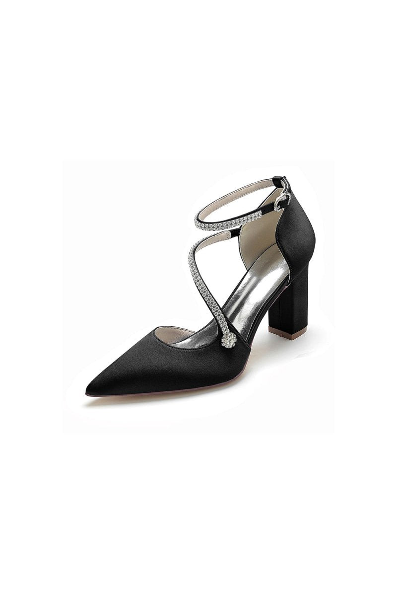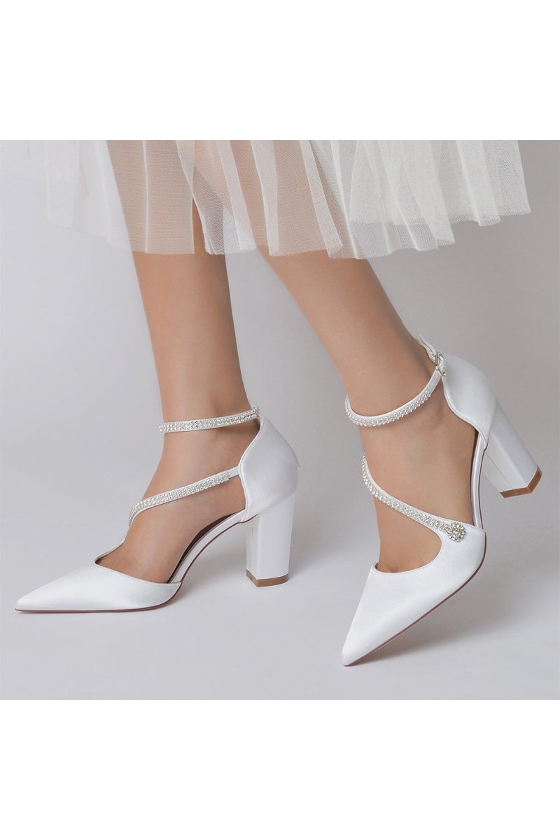 Step into elegance with these White Satin Pumps featuring a chic cross-strap design and a stunning beaded buckle. Perfect for prom shoes, wedding shoes, evening shoes, party shoes, and bridesmaid shoes, these chunky heels with a pointed toe are a sophisticated choice for any occasion. With rhinestone accents, artificial leather lining, and a rubber sole, they offer both style and comfort for your special day.