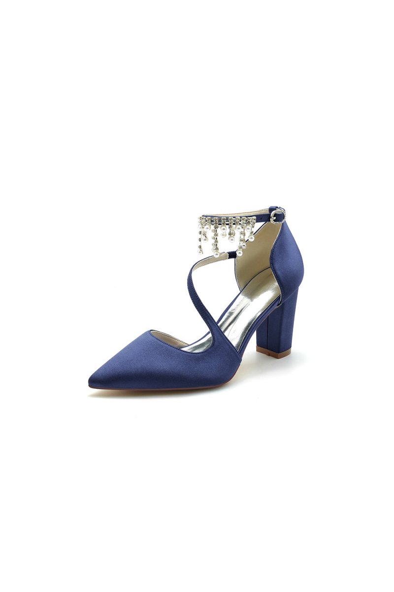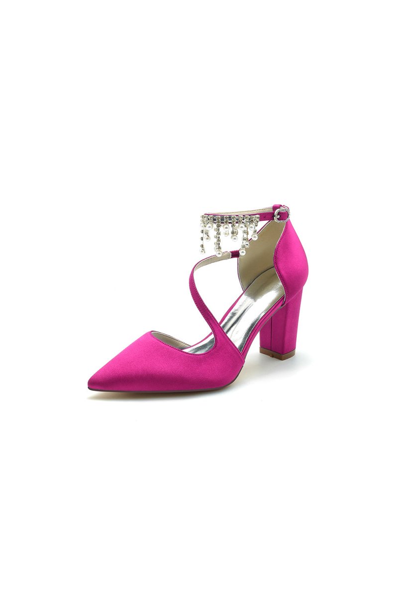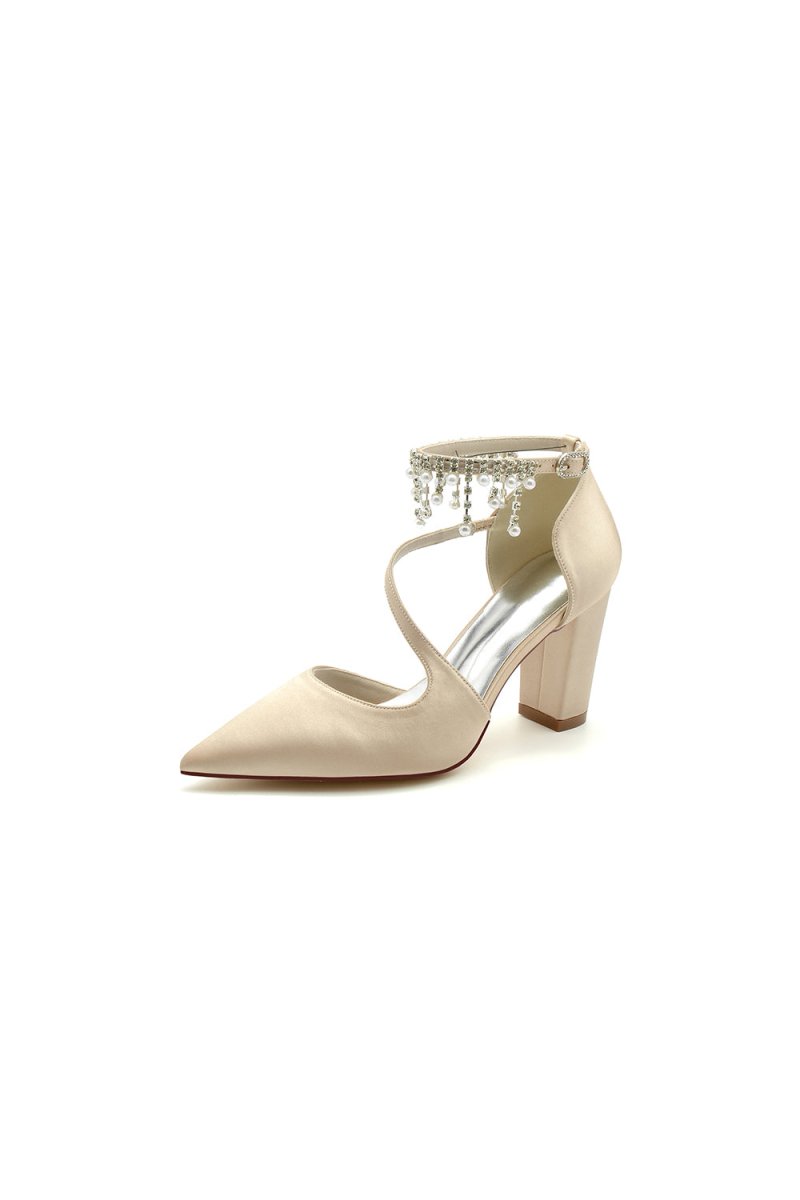 These elegant White Satin Pumps with a pearl-embedded chain heel are the perfect choice for prom shoes, wedding shoes, evening shoes, party shoes, and bridesmaid shoes. Featuring a pointed toe, chunky heel, and one-buckle strap, they combine timeless style with comfort. The artificial leather lining and rubber sole ensure durability and support for any occasion.